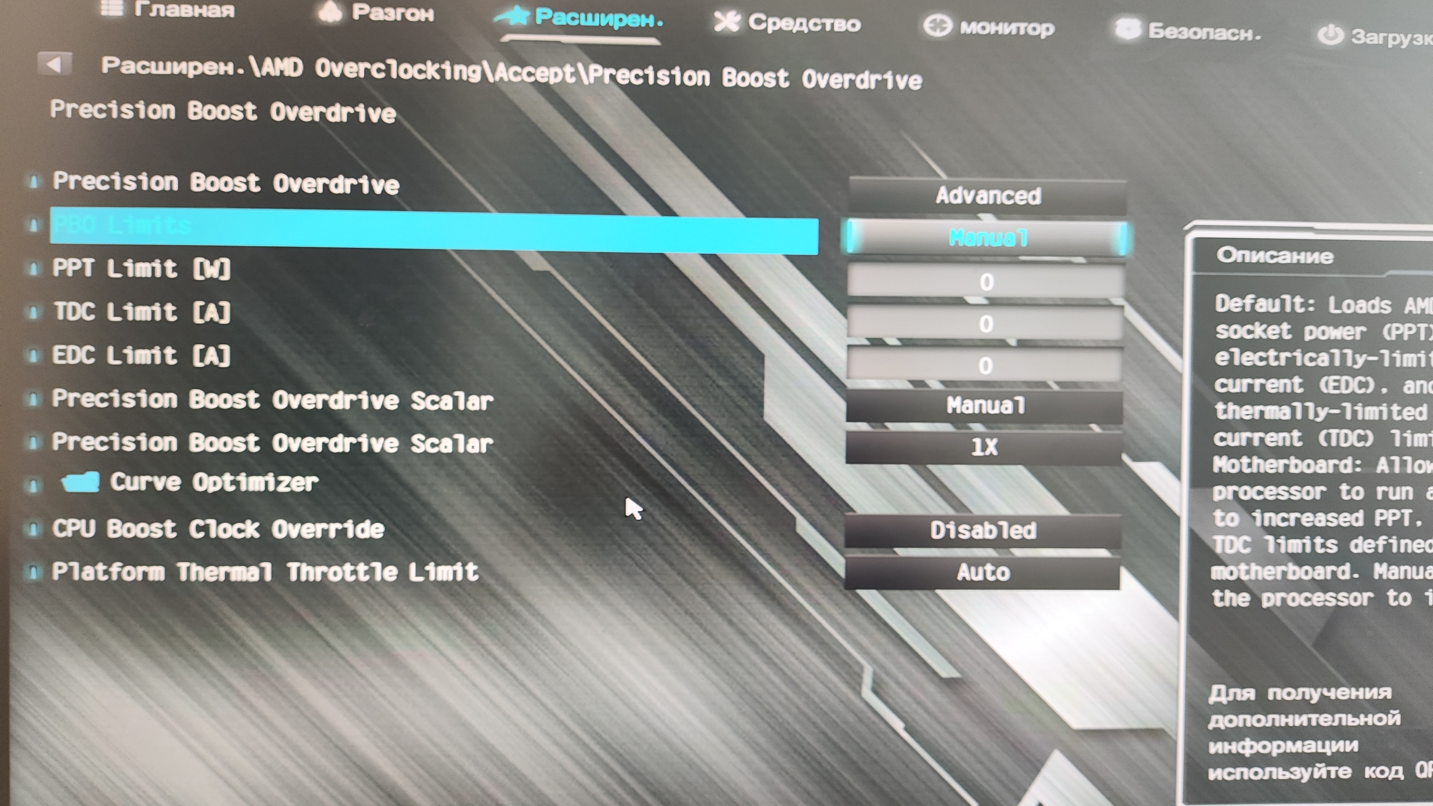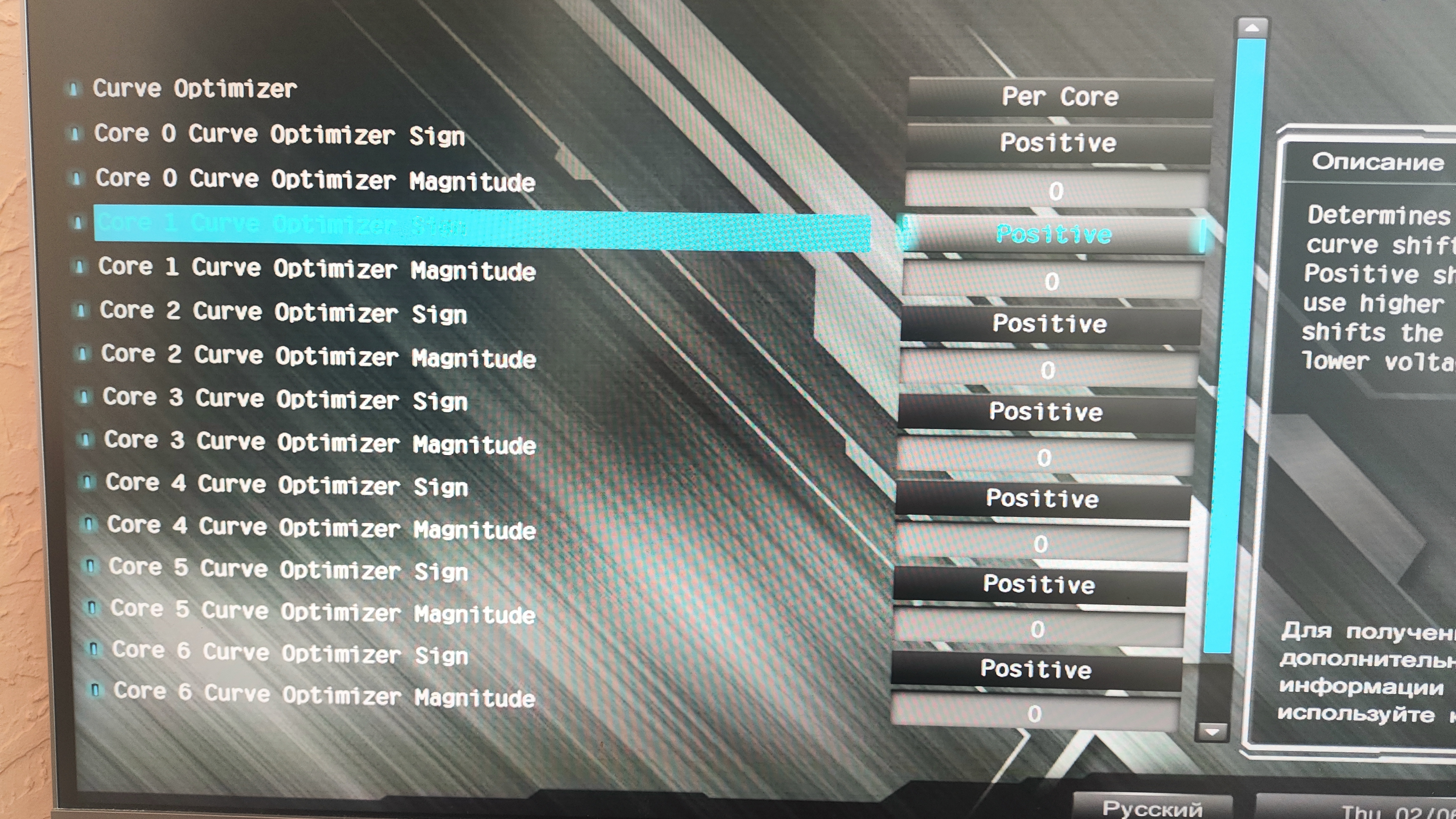 Лично я выставил сразу лимиты по максимуму что может VRM материнки и сколько может переварить охлаждение. Precision Boost Overdrive Scalar чем больше значение, тем позже и менее агрессивно процессор сбрасывает частоты после того как пропала нагрузка. Выставил на максимум. Что касается Load-Line Calibration то для всего кроме VCore выставляю в самое агрессивные значения, хотя и для VCore тоже. Precision Boost берёт во внимание показания именно мониторинга, а не запрашиваемое значение. Мониторинг материнской платы читается Precision Boost`ом через такой протокол как SVI2 TFN. Технология заключается в следующем: 1)выставляем Желаемый VCore Offset, если выставляем его в сторону увеличения, то малопоточная производительность будет выше, если в сторону уменьшения то многопоточная производительность будет выше. Под каждую настройку VCore Offset надо подправлять значения Curve Optimizer, 2)сначала для всех ядер уменьшаем Curve Optimizer, 3)запускаем скрипт, упомянутый выше, повторяем шаг номер 2, пока ни начнёт вываливаться ошибка на одном или нескольких ядрах и откатываемся на один шаг 4)запускаем после этого Cinebench R20, с большой вероятностью система просто перезагрузится, это по большей части лечится добавлением CPU PLL напряжения с 1,8V, но не превышая 1,9V, хотя от чрезмерного напряжения PLL может начаться обратный эффект и стабильность пропадёт, 5)далее начинаем настраивать Curve Optimizer для каждого ядра отдельно и проверяем стабильность как в шагах 3-4.