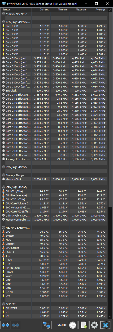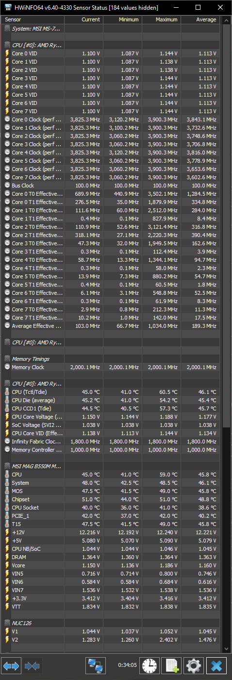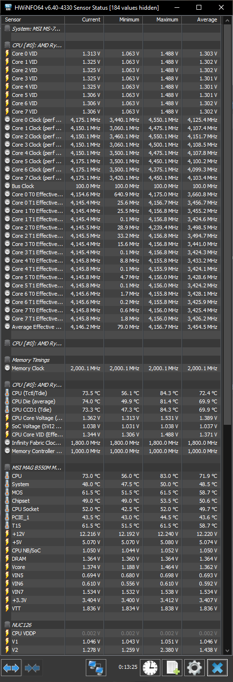 Эм... речь точно идет не об эффективной частоте? Какие то странные цифры. Если что эффективная частота это своего рода "процент загрузки потоков" под другим соусом. Лучше бы кинули пачку скринов из hwinfo64 под разной нагрузкой/простоем, чтобы было видно потребление, вольтаж, обороты вертушек и т.д. Речь о замерах именно в момент нагрузки, а не после. Полностью развернутый список всех датчиков из hwinfo64.