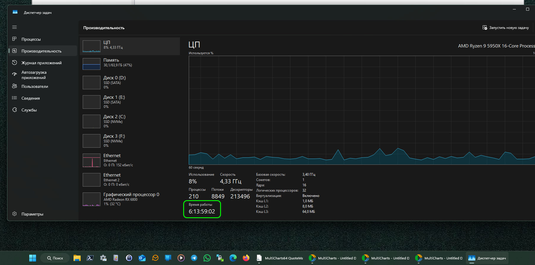 Это еще что! Включаю комп, запускаю мультиядерный тест CBR23, - почти 12000 попугаев. После погоняю в сталкер 2 пару часиков, выхожу, запускаю снова мультиядерный тест CBR23, - 11400 попугаев. Разогрелся компич от сталкера второго) А zen3 известны такой зависимостью, - дай им хороший и эффективный охлад, в ответ они бустят не по-детски!