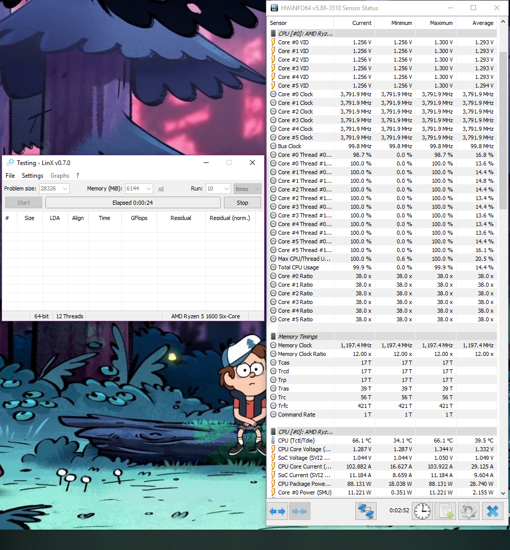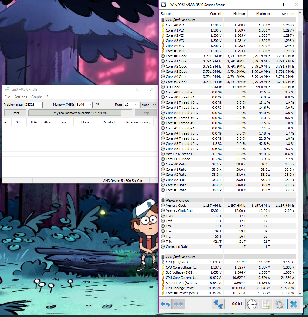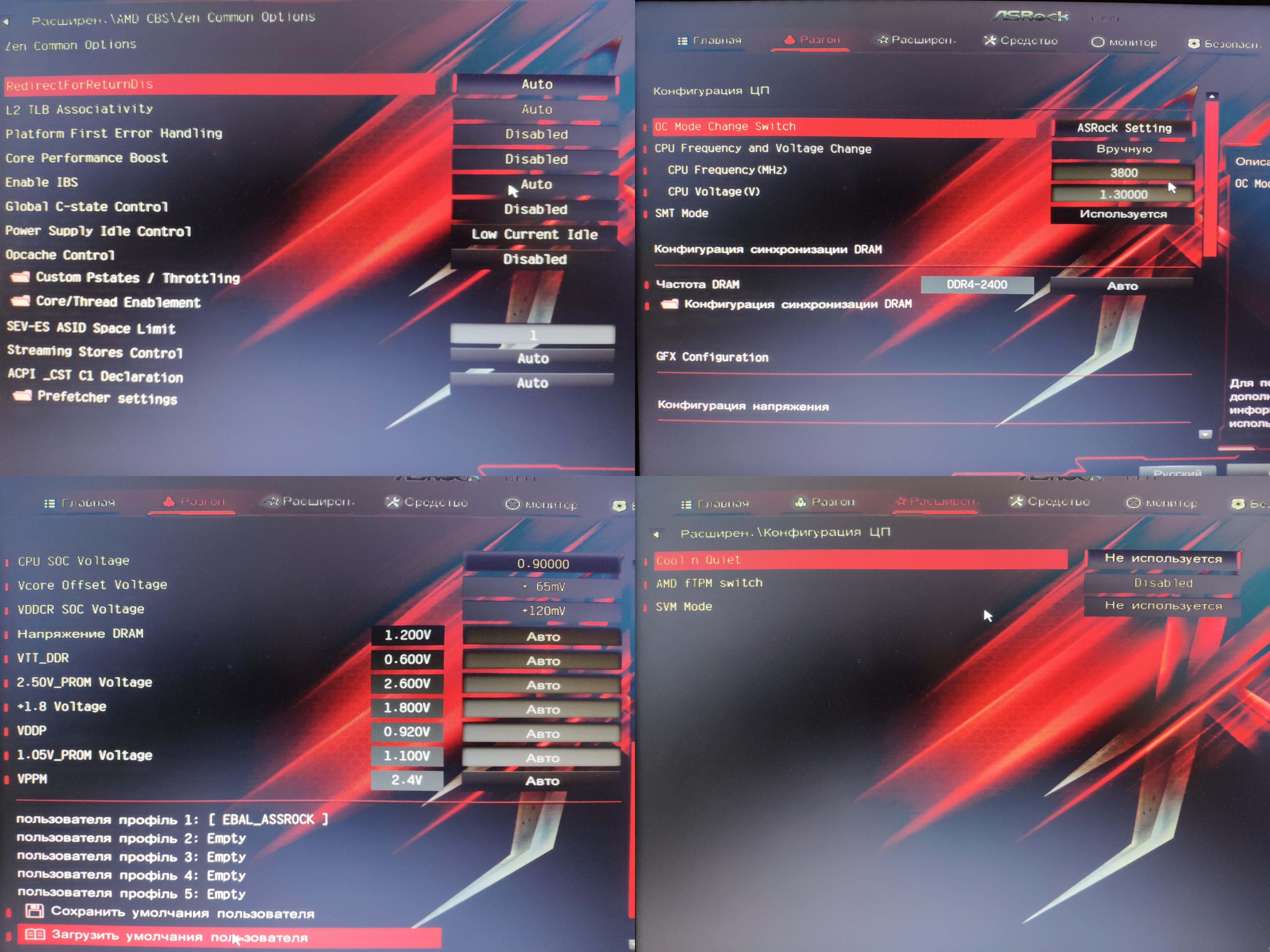 Добрый день, приобрёл себе процессор AMD Ryzen 5 1600 с материнской платой AsRock X370 Killer SLI, естественно бралось для разгона, чем и занялся. Накатил BIOS последней версии, но оказалось что мат. плата из ревизии в которой ASRock убрали LLC из настроек биоса, что уже немного смутило. Так же оказалось, что нет возможности выбрать способ изменения вольтажа, доступны сразу и manual и offset. Для vSoC изменение напряжения manual не приводит к реальным изменениям напряжения, работает только offset. Для vCore вольтажа работает и offset и manual, но offset с достаточно большой погрешностью (при +200mv реально добавляется ~165mv). Ставил частоту @3.8, с вольтажем c manual 1.2875v+65mv offset до manual 1.3v+120mv offset, постоянно в тестах была одна и таже проблема, при нагрузке вольтаж занижается ~ на 0.05v он значения manual+offset, после чего компьютер повисает. В простое завышается от значения manual на offset. C-State, Q&C, Core Perfomance, троттлинг отключены. В чём может быть проблема такого поведения? Прикладываю настройки биоса и прогона в LinX.