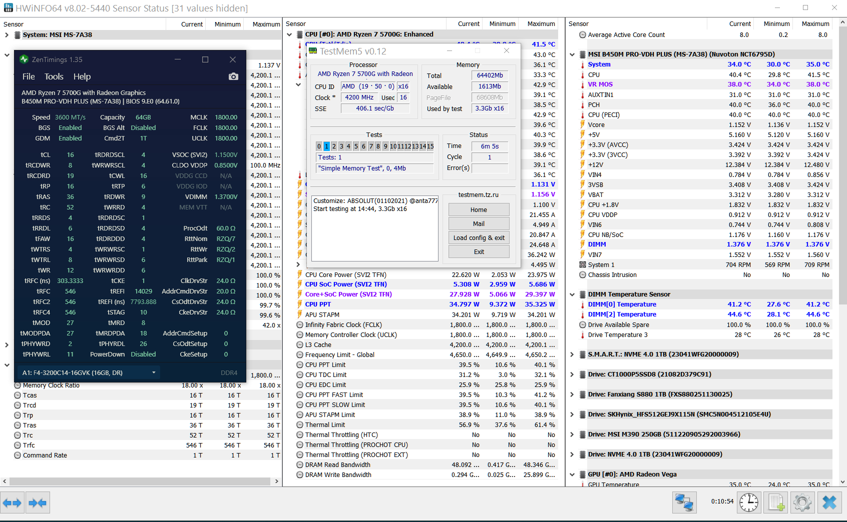 А мой 5600х в связке с гскил так активно работает, что планки могуь нагреться до 60 С по Цельсия во время игры в фар край нью дон. Так я заметил, что если при таких температурах начинает память нестабильно работать, нужно просто чуть поднять (разжать) тайминг tRFC. например, было 496, начали при прогреве сыпать ошибки, поставил 512. И норм. Но это в связке с Райзеном 5600х. Может на процах с буквой g таких проблем нет. Не могу точно сказать.