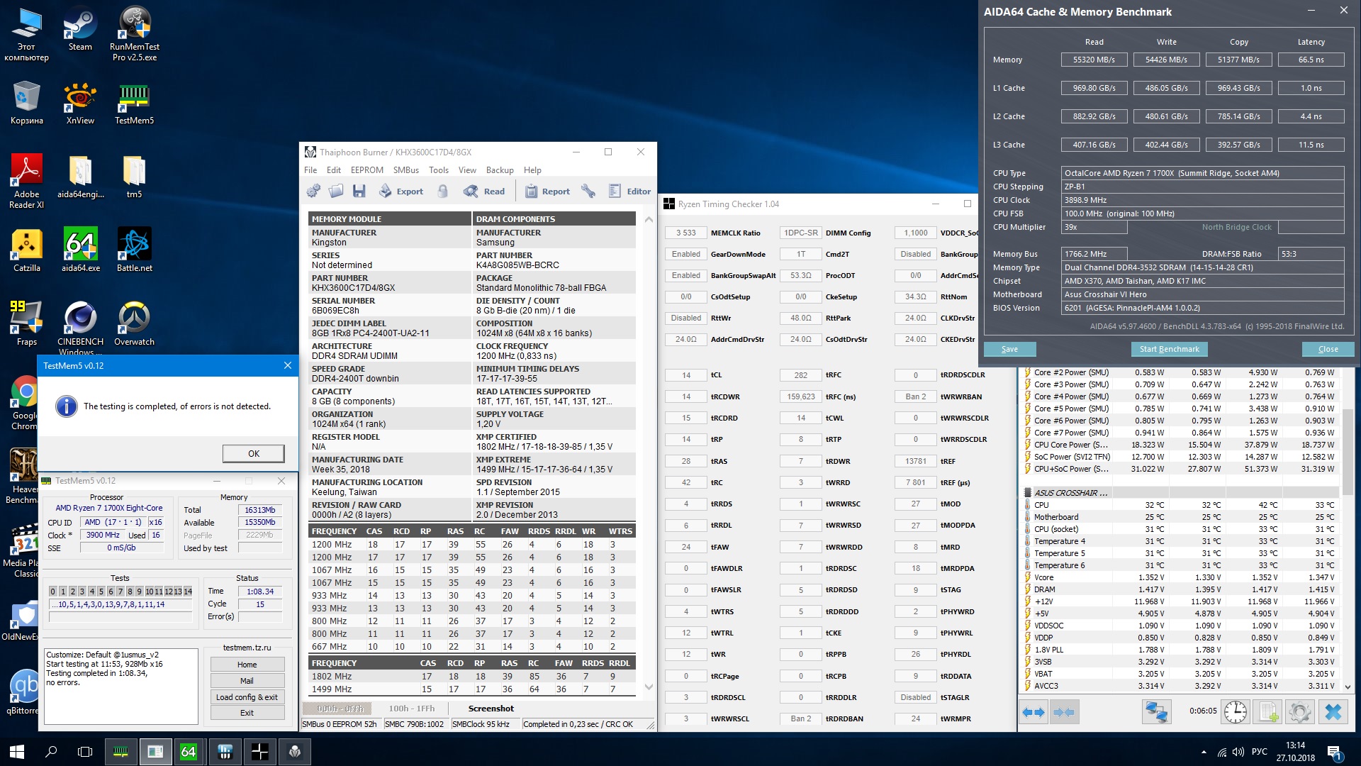 Пост о колупании с рязанью. Добился 99% стабильности при данных настройках. Asus c6h, Ryzen 1700X, Kingston HyperX HX436C17PB3K2/16. Реальные показатели напряжений при прогоне LinX: Vcore=1.38, Soc=1.124, Dram=1.44. В биосе 1.36.LLC1, 1.1.LLC4, 1.42 соответственно.