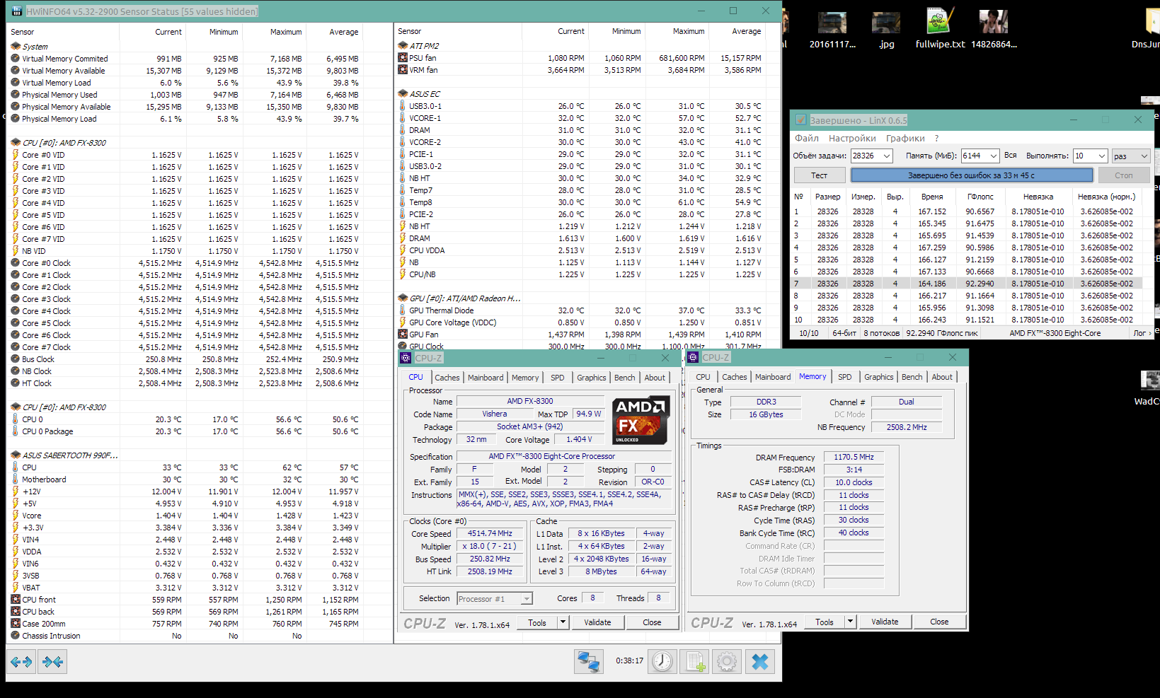 Не пойму что может быть на скрине, чего нету в словах. Держи, уж пардон за размер окон, иначе никак - лень возится со скрытием датчиков и прочее. Ну и что скрин показал, что не так или все в норме? Меня больше интересует как снова 95гфлопс воспроизвести.