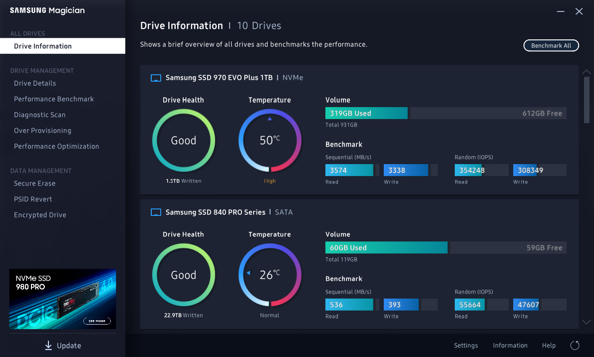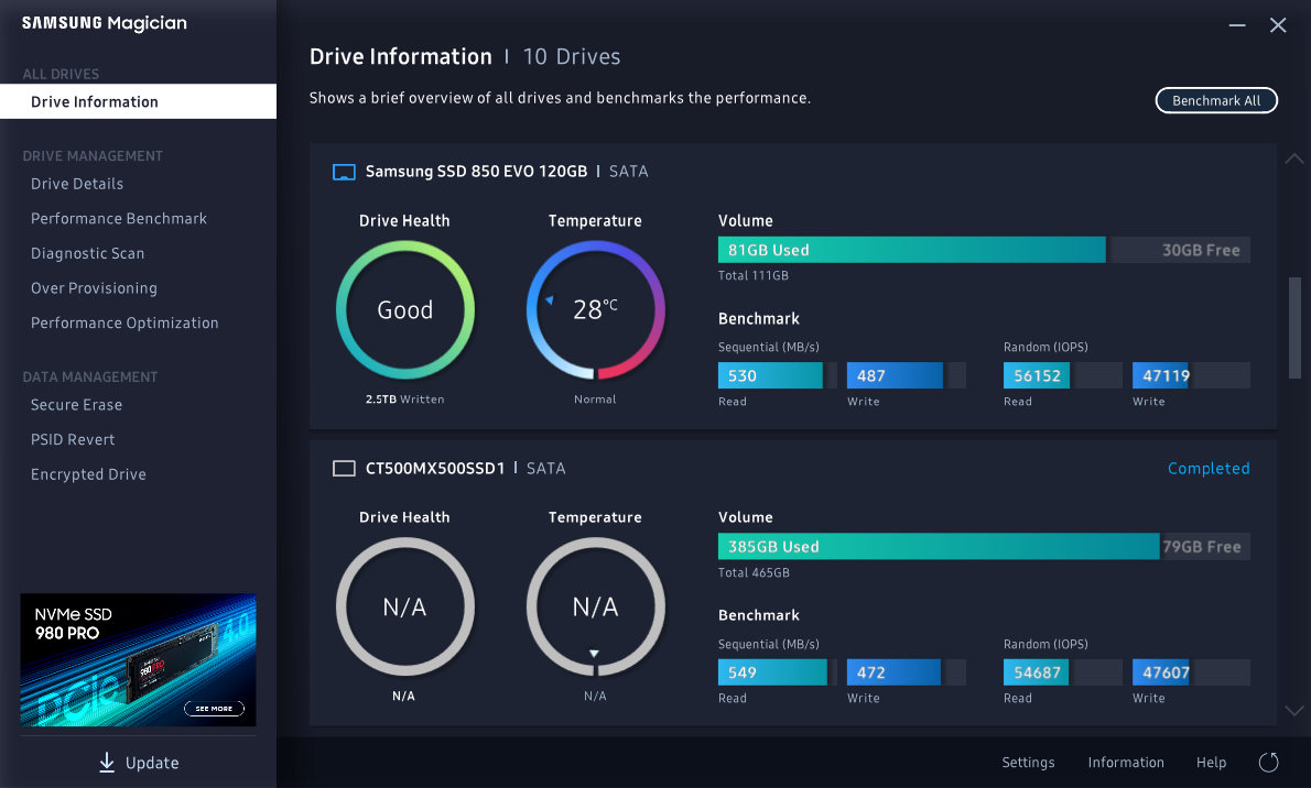 Скрины из Magician, в других бенчах всё примерно так же. 840PRO, 850EVO и MX500