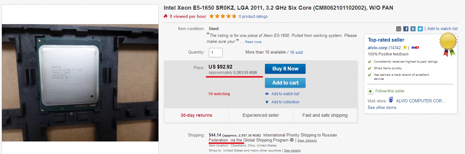 Я не могу привести доказательства, актуальные для России, потому что не живу в России. Мне материнская плата с Тао обошлась в 130 долларов с доставкой и всеми комиссиями. Доставка процессора и памяти с eBay - по 3 доллара за посылку через посредника. Очень сильно сомневаюсь, что в России все это будет стоить гораздо дороже. Память так вообще можно с прямой доставкой в РФ найти за 30 баксов. Вот, например: http://www.ebay.com/itm/Samsung-16GB-4x ... 2209429061 Ну вот теперь можно все посчитать: память стоит 30 баксов, процессор 90, плата посреднику за доставку процессора - пусть будет 15 (кто-то на форуме вроде за 10 долларов заказывал). Итого 135. Теперь материнская плата. Комиссия 1000pokupok - 10%, получаем 110 баксов. Вес платы с коробкой - 1,34 кг. Идем на страницу с калькулятором и считаем доставку: https://1000pokupok.shop/delivery/ 1,34 кг - 675 рублей за эконом-вариант и 1200 за экспресс. Берем "экспресс", 1200 рублей - это примерно 20 баксов. Теперь считаем все вместе: 135 + 110 + 20 = 265. Больше 250, но все еще дешевле одного Ryzen 1600. Если выбрать медленную доставку по земле, то получится сэкономить 10 долларов, и итоговая сумма составит уже 255 долларов.
