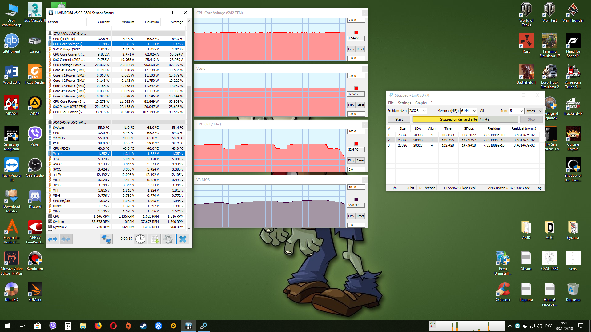 - Обычно поставляется в коробке с системой охлаждения Wraith Spire RGB (это круглая конструкция из целого куска алюминия с медной вставкой-испарительной камерой в основании и вентилятором с кольцом разноцветной подсветки, крепится к задней пластине разъёма AM4 четырьмя винтами). - Штатно имеет базовую частоту 3.0ГГц, частоту 3.2ГГц (технология Turbo Boost) при обычной многопоточной нагрузке (Blender n-cores render) и 3.75ГГц (технологии Precision Boost и XFR) при однопоточной нагрузке (Cinebench R15 single core). - Штатное напряжение питания 1.1875В. Может возрастать до 1.3В на отдельных ядрах во время работы Precision Boost и XFR. - Очень энергоэффективный, требования к СО (TDP) - всего 65W. Энергопотребление порядка 10Вт в простое и 85Вт в обычной многопоточной нагрузке (Blender n-cores render).