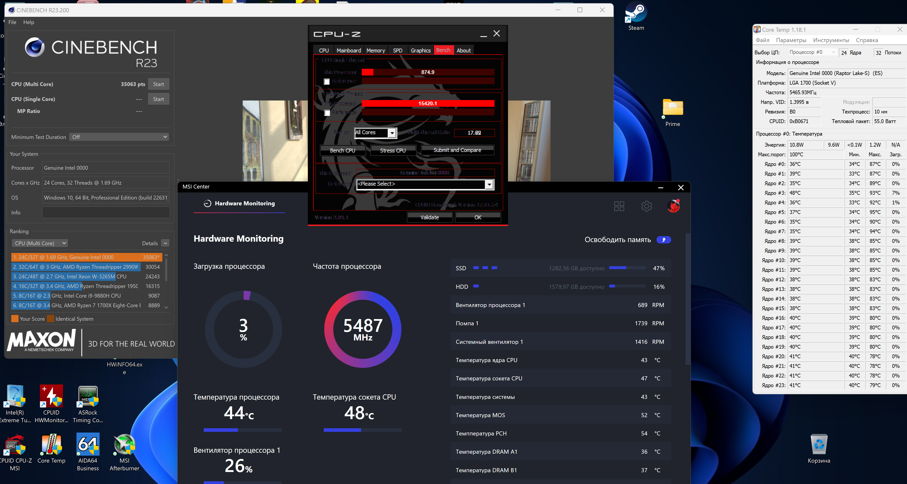 MSI MPG B760I EDGE WIFI 13950HX скальп + ЖМ + кастомная вода 420 LLC = 8 AC LL = 60 DC LL = 100 CPU Voltage offset = -0.08 (by CPU) PL1=PL2=253w IA 300A В тестах ~220w, t до 95', t за бортом 27,5'