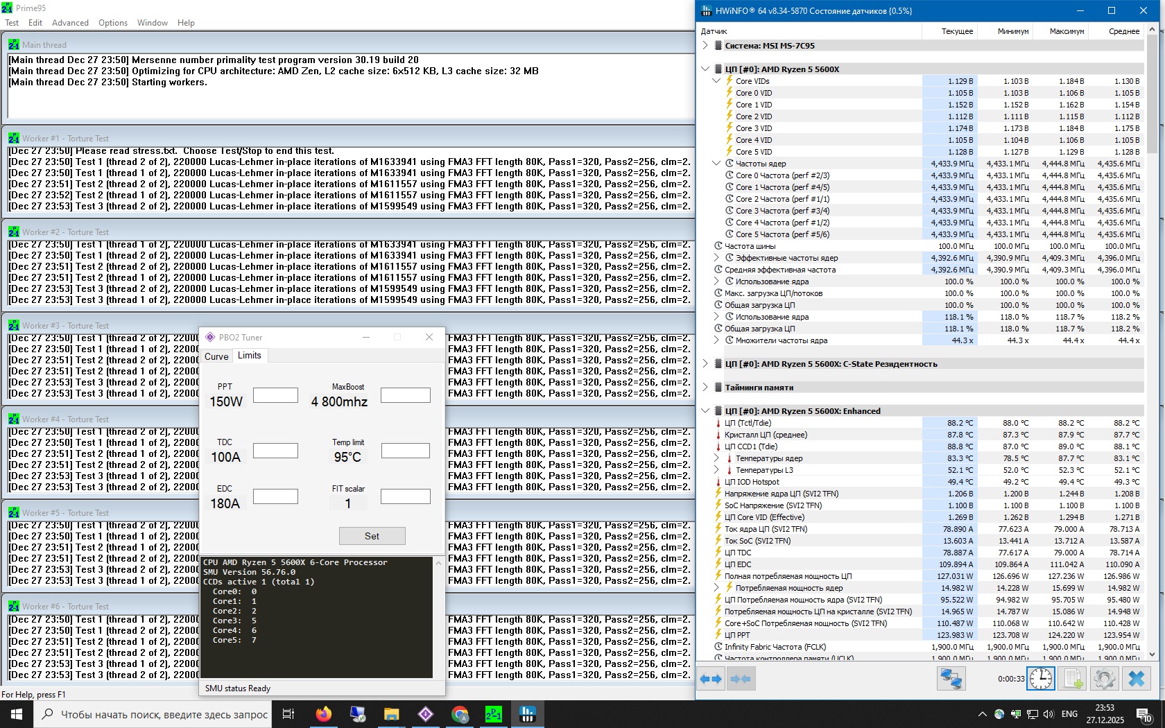 Лично я выставил сразу лимиты по максимуму что может VRM материнки и сколько может переварить охлаждение. Precision Boost Overdrive Scalar чем больше значение, тем позже и менее агрессивно процессор сбрасывает частоты после того как пропала нагрузка. Выставил на максимум. Что касается Load-Line Calibration то для всего кроме VCore выставляю в самое агрессивные значения, хотя и для VCore тоже. Precision Boost берёт во внимание показания именно мониторинга, а не запрашиваемое значение. Мониторинг материнской платы читается Precision Boost`ом через такой протокол как SVI2 TFN. Технология заключается в следующем: 1)выставляем Желаемый VCore Offset, если выставляем его в сторону увеличения, то малопоточная производительность будет выше, если в сторону уменьшения то многопоточная производительность будет выше. Под каждую настройку VCore Offset надо подправлять значения Curve Optimizer, 2)сначала для всех ядер уменьшаем Curve Optimizer, 3)запускаем скрипт, упомянутый выше, повторяем шаг номер 2, пока ни начнёт вываливаться ошибка на одном или нескольких ядрах и откатываемся на один шаг 4)запускаем после этого Cinebench R20, с большой вероятностью система просто перезагрузится, это по большей части лечится добавлением CPU PLL напряжения с 1,8V, но не превышая 1,9V, хотя от чрезмерного напряжения PLL может начаться обратный эффект и стабильность пропадёт, 5)далее начинаем настраивать Curve Optimizer для каждого ядра отдельно и проверяем стабильность как в шагах 3-4.