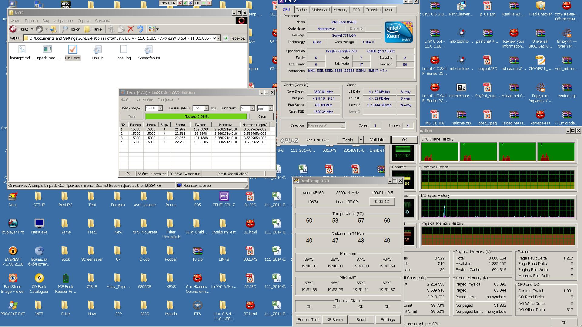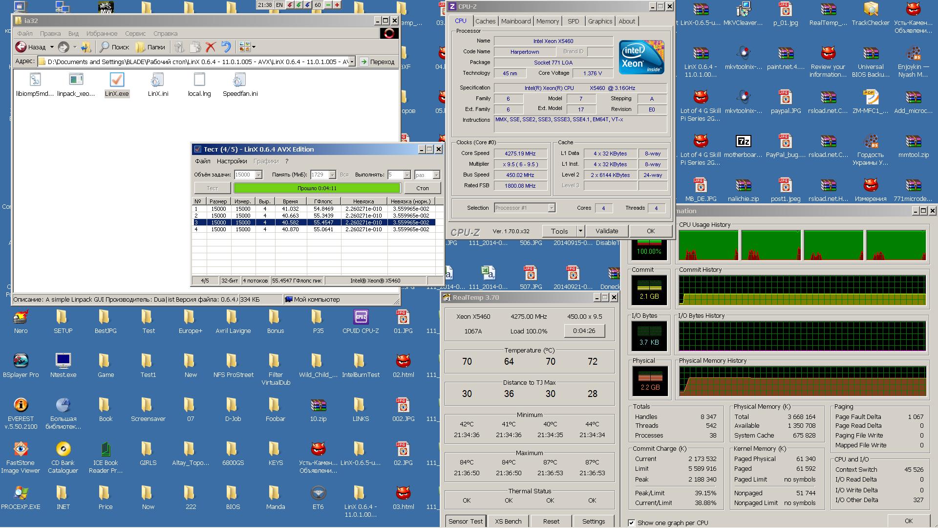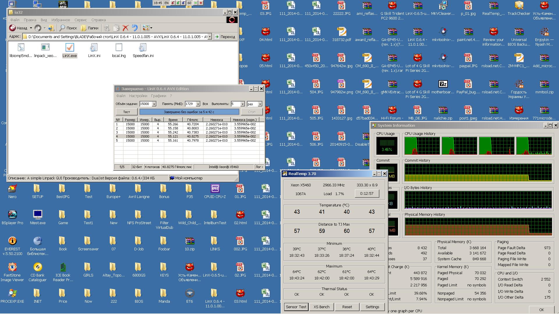 Здравствуйте! Расскажу про свой Ксеон. В начале февраля собирался взять i5-4670K, но в связи с девальвацией посчитал что сильно дорого получится брать все с нуля (компы меняю редко - предыдущий на 865-м чипсете и проце E5700 с 2007 года). У меня еще был Q9550 с MSI P45 Neo (достался по дешевке за работу) - решил взять нормальную материнку к нему и прожить года 2-3. С ибея притащил GA-EP45-UD3P (rev. 1.1), для разгона взял еще Cruical Ballistix DDR2-1066 4x2 ГБ - но проц хоть и ревизии E0 отказывался в разгоне стабильно работать 4250 (8.5x500). В memtestе 4.20 память в 7 тесте давала 6-10 ошибок при делителе 1:1. Заказал еше несколько видов памяти (G.Skill F2-8800CL5Q-8GBPI, Mushkin 996599, G.Skill F2-8500CL5D-4GBPK) - все давали ошибки в этом тесте, хотя были у меня 4x1 ГБ Kingston HX 1066 проходившие его на частоте 1000 МГц и делителе 1:1 без ошибок. И только попавшая в мои руки такая же плата но ревизии 1.0 убедила меня, что дело не в памяти а в чипсете - не тянет он шину 500 и 8 ГБ памяти при делителе 1:1. Посмотрев на работу материнки на шине 500 решил ее не мучать и использовать на щадящей частоте 450. С этой целью был заказан на али X5460 за 38$ - китайцу было дан строгий наказ, что нужна именно ревизия E0. Китаец прислал все нормально, но (видно с "перепугу") забыл положить адаптер-наклейку. Поискав ее в городе (бесполезно) заказал с доставкой в 12 дней и вот 31 декабря переходник пришел. 1 января прошил материнку новым биосом (в родном микрокодов ксеона не было) наклеил наклейку и установив проц включил комп - постоянные ребуты через 3-4 секунды. Поматерив в душе китайца-продавца процессора (отзыв я то уже две недели как ему выслал) решил еще раз внимательно посмотреть на адаптер. Оказалось два этих меняющихся контакта вылезли вверх на пол миллиметра - аккуратно поправил, вставил процессор - и все завелось. Теперь уже установив кулер Alpenföhn Nordwand и пасту ARCTIC MX-2 включил комп и начал смотреть в Аиде на проц. Расстроил высокий VID - 1.2875V, но зато были низкие температуры (Кстати пишу только 7-го потому что смотрел, что написал народ в ветке - так вот, кто-то уже вспоминал про то, что процы с больши VID меньше греются - подтверждаю - в августе заказал с Торонто пять E8500 rev.E0 - так там был один с таким же VIDом и хотя разогнался до 4500, но почти не грелся, а лучше всех вел себя в разгоне проц с VID 1.2375, хотя и был горячее). В общем взял его не зря - стабильно работает и на 400 шине и на 450-й (по крайней мере Linx проходит). На постоянку оставил 3800 9.5x400, т.к. на этой частоте работает на номинале (только на MCH прибавил 0.1V - все же 8 ГБ), а значит все энергосбережающие технологии работают (множитель и вольтаж сбрасывает, уходит в глубокий сон, при выходя из спящего состояния, при перезагрузке и при включении двойного старта не делает). Для игрушек (тем более играю редко) осталась Win7 и 4250 9.5x450.