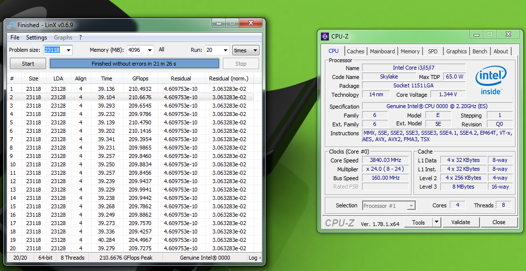 Для блиц-теста на 2-3 минуты можно добавить 0.016v на процессор с включённым мониторингом температур. Выше 1.376v (1.392-1.408v) в LinX (с большой задачей ) для теста полной стабильности нужен скальп, иначе ядра просто не успеют отдать тепло на крышку-теплосъёмник. Ошибки и зависания могут возникать из-за перегрева. Самые тяжёлые игры и кодинг будут греть на 15-25 градусов меньше. Поэтому на таких напряжениях долговременные тесты имеет смысл проводить в x265 HD Benchmark, Прайме и любимой игрушке. А LinX использовать только для ускоренной проверки с небольшим объёмом задач.