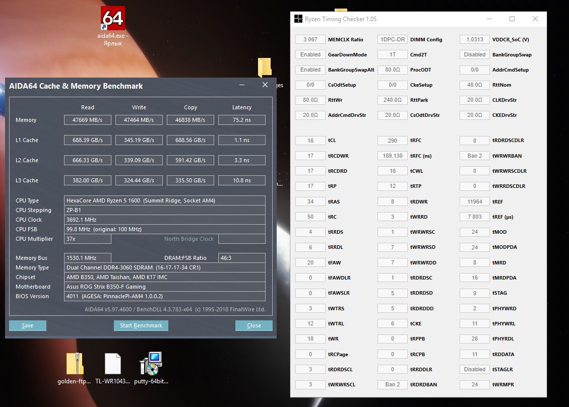 Вчера еще немного поковырялся, немного снизил tRC (68 - 60) и tRFC (382 - 370), добился в винраре 10500 кб/с, а вот в той же аиде ничего не изменилось, прям совсем В играх даже не знаю, может что-то и изменилось, но это надо мониторить