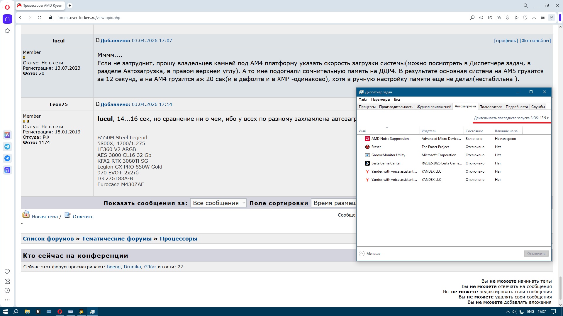 Мммм.... Если не затруднит, прошу владельцев камней под АМ4 платформу указать скорость загрузки системы(можно посмотреть в Диспетчере задач, в разделе Автозагрузка, в правом верхнем углу). А то мне подогнали сомнительную память на ДДР4. В результате основная система на АМ5 грузится за 12 секунд, а на АМ4 грузится аж 20 сек(и в дефолте и в ХМР -одинаково), хотя в ручную настройку памяти ещё не делал(нестабильна ).
