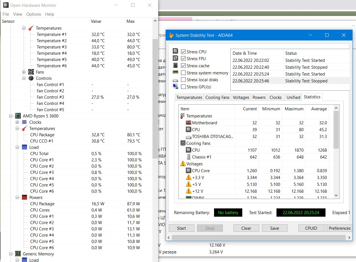 Так как 1,35в оказалось не стабильным, а лишь запускало винду, то я скинул проц обратно в авто (бустится сам до 4,2). Запустил аиду в режиме теста стабильности системы, но сам тест не запустил, открыл лишь окно со статистикой где отображаются пиковые, средние, текущие и минимальные значения.