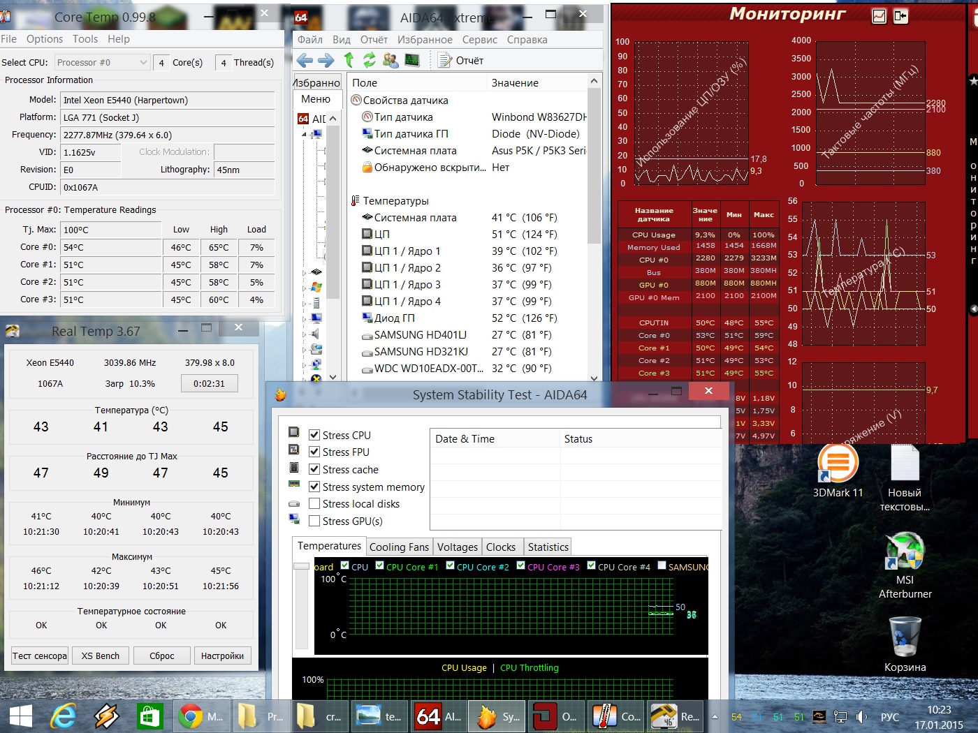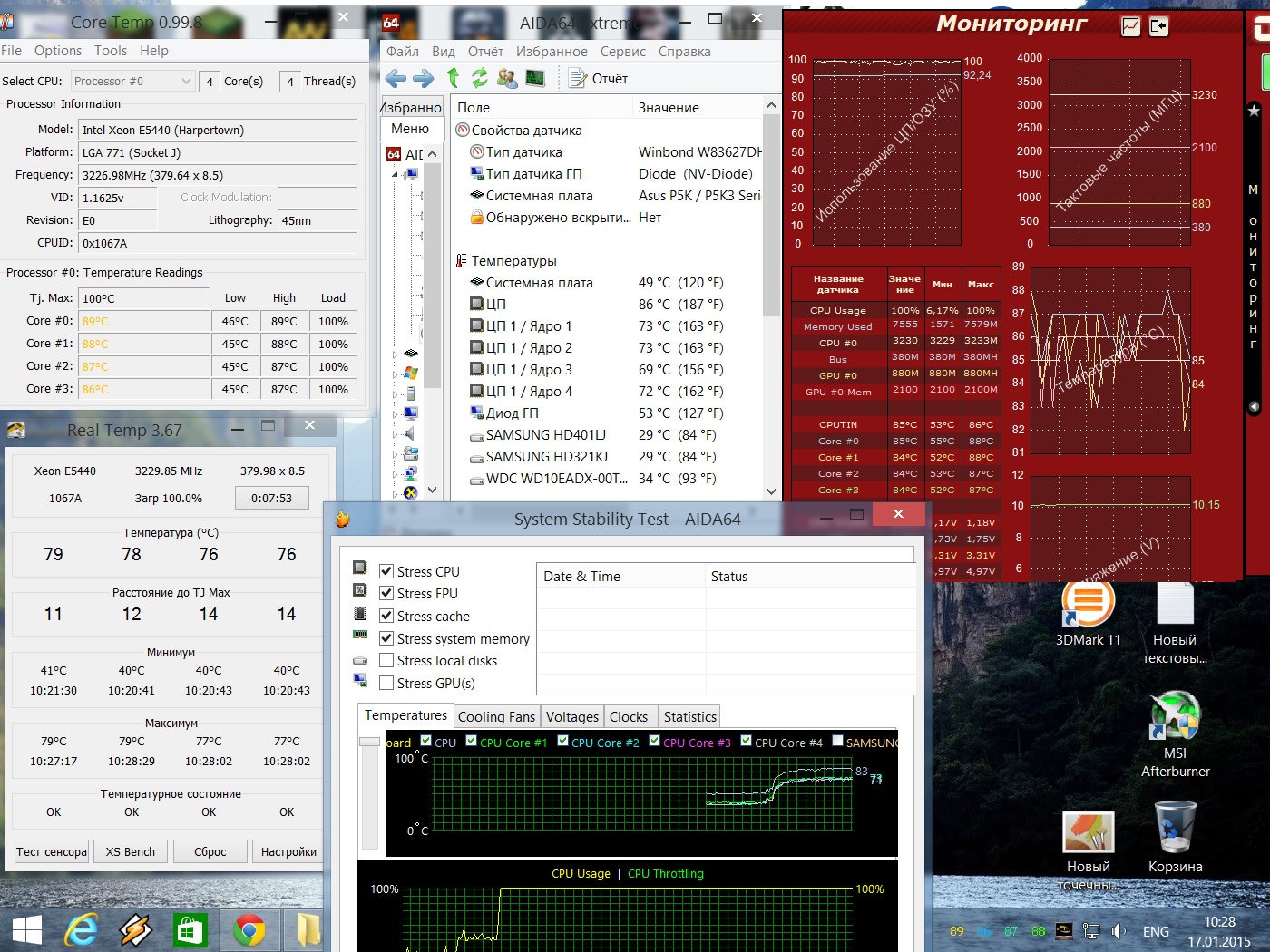 Подробней, ну как-то так . Под нагрузкой OCCT LINPACK , если дальше гнать (более 3.4), то t ползет выше. Охлаждение: Два куллера спереди и один на выдув ( в комнате 25-27 С), на процессоре Zalman 9500 с дополнительным обдувом,питание cooler master 550. И смущает разница по показаниям температуры.