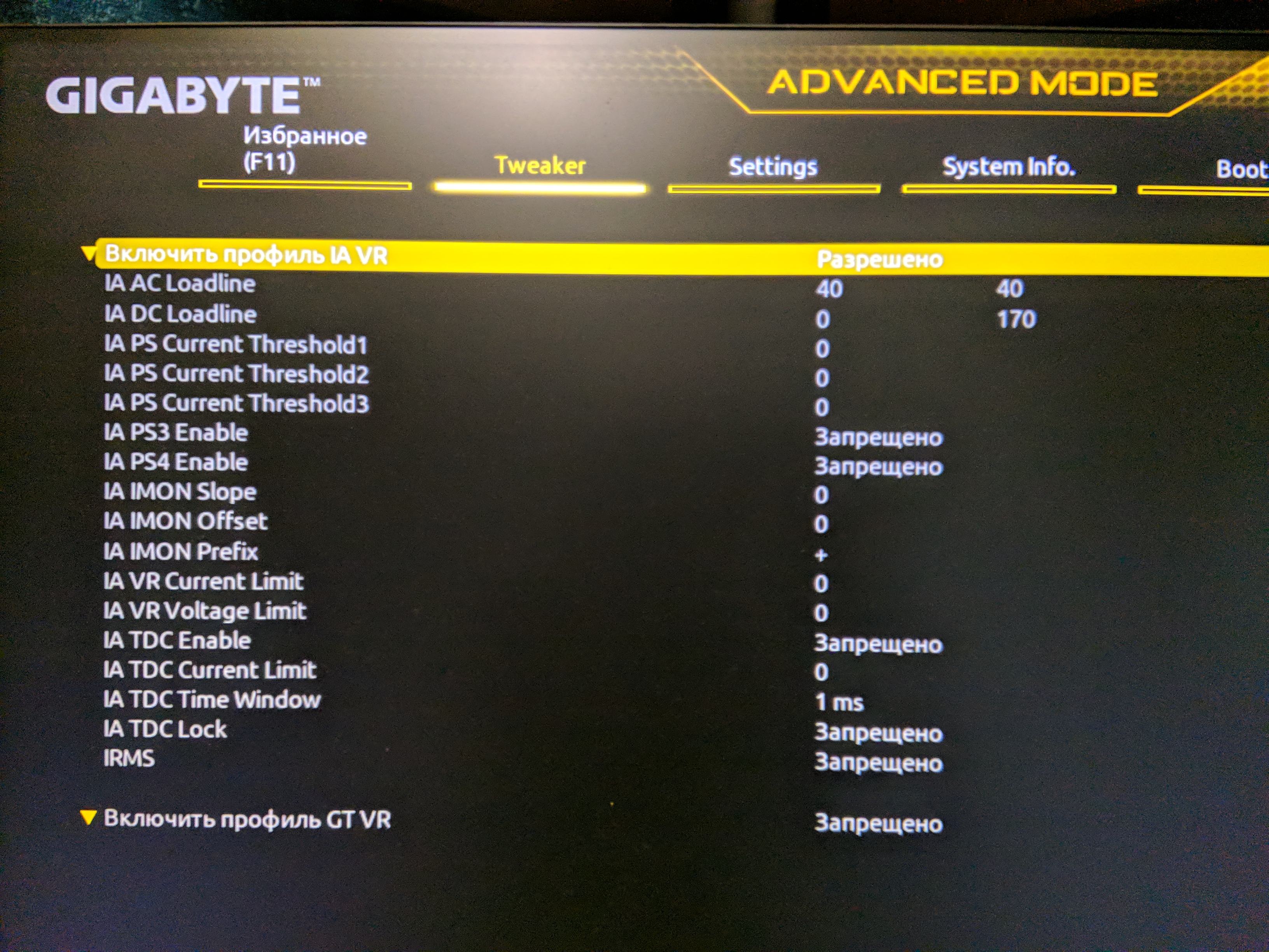 N1ghtwish у меня заработала с этой IA AC Loadline на 40 мОм для гигабайт настройкой, сейчас стоит андервольтинг -70, температуру прилично снижает, особенно заметно в играх кулера намного меньше молотить стали и тише стало, меньше шума, меньше износа кулеров и меньше пыли насасывать в корпус будет это плюсы андервольтинга, смысл в нём есть большой.