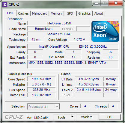 Свойства CPUID: Производитель CPUID GenuineIntel Имя ЦП CPUID Intel(R) Xeon(R) CPU E5450 @ 3.00GHz Версия CPUID 0001067Ah Идентификатор марки IA 00h (Неизвестно) Идентификатор платформы 2Dh / MC 40h (LGA771 DP) Версия обновления микрокода A0Bh HTT / CMP 0 / 4 Температура Tjmax 85 °C (185 °F)