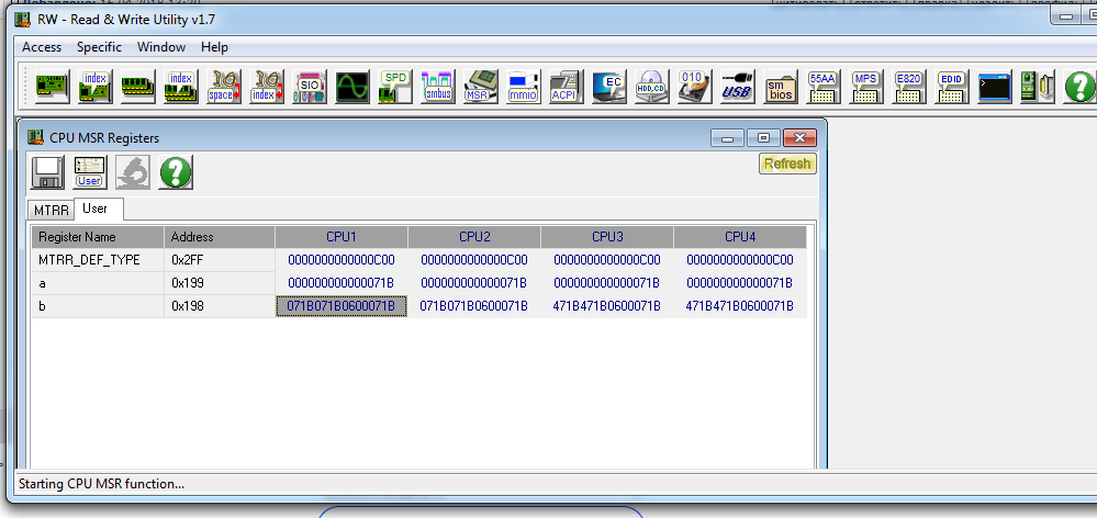 JohnnyD Тогда надо править IA32_PERF_CTL. Это можно сделать при помощи RWEverything (лучше Portable версией). Запускаете, нажимаете кнопку MSR, выбираете вкладку User, нажимаете F5, вбиваете a=0x199, жмете Add, вбиваете b=0x198, жмете Done. Потом двойным щелчком кликаете на клетку на пересечении a (0x199) и CPU1. Дважды (медленно) кликаете на 07 в нижней строке и вводите 47 и жмете Done. Делаете скриншот.