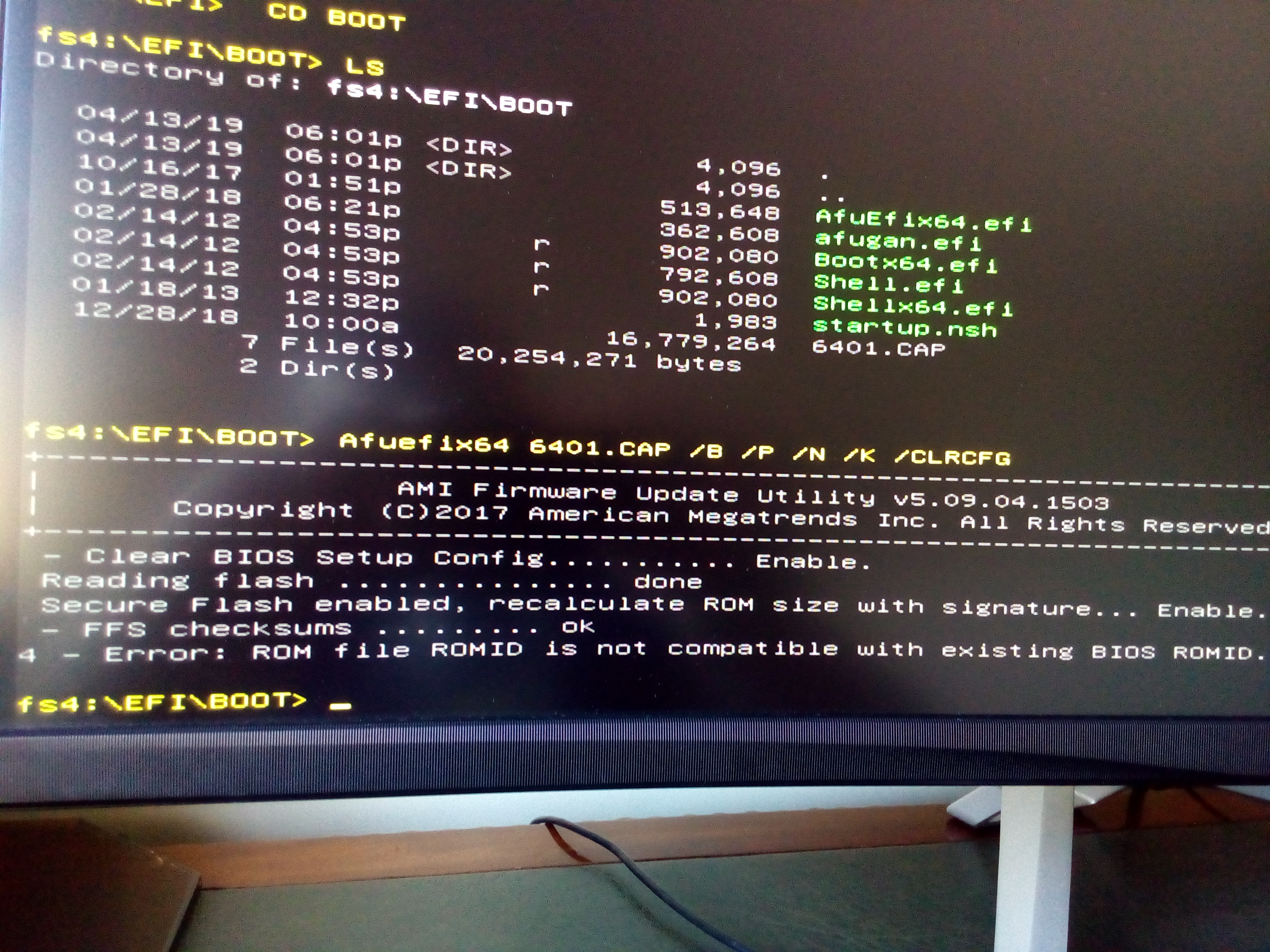 попробовать с этими ключами? Afuefix64 имя_биоса.CAP /B /P /N /K /X /CLRCFG