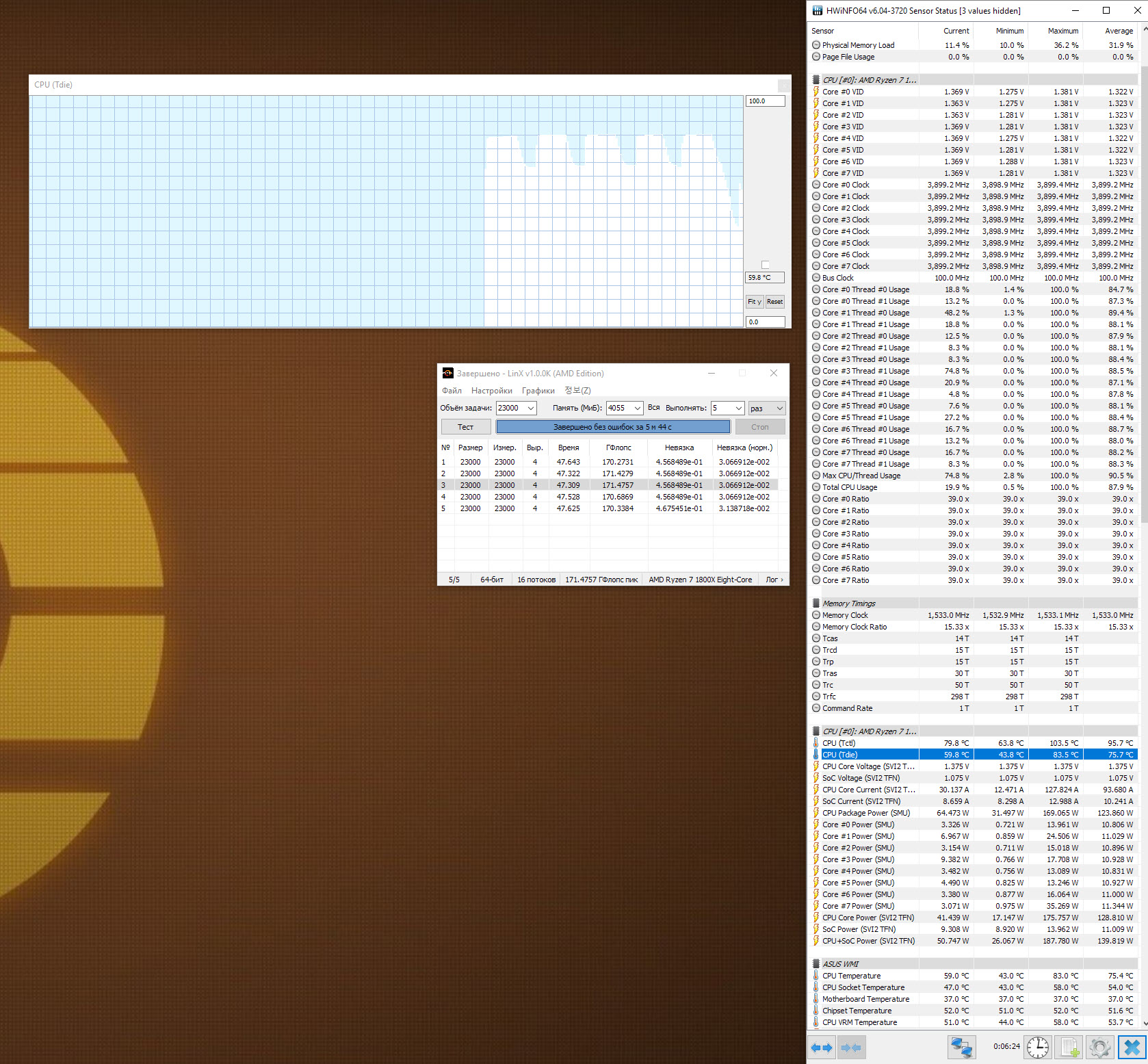 - Обычно поставляется в небольшой коробке без СО. - Штатно имеет базовую частоту 3.4ГГц, частоту 3.5ГГц (технология Turbo Boost) при обычной многопоточной нагрузке (Blender n-cores render) и 3.9ГГц (технологии Precision Boost и XFR) при однопоточной нагрузке (Cinebench R15 single core). - Штатное напряжение питания 1.35В. Может возрастать до 1.4В на отдельных ядрах во время работы Precision Boost и XFR. - Энергоэффективность средняя, требования к СО (TDP) - 95W. Энергопотребление порядка 13Вт в простое и 120Вт в обычной многопоточной нагрузке (Blender n-cores render). - По сравнению с R7 1700 имеет увеличенный промежуток XFR (100МГц вместо 50МГц), а также увеличенные технологией SenseMI показатели температуры на 20 градусов (например, 90 при реальных 70).