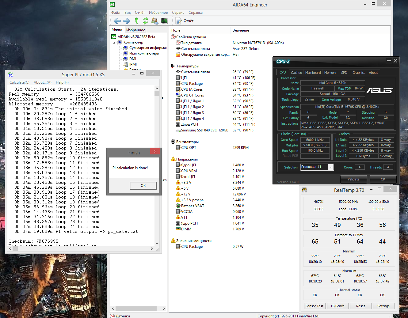 #77 4670k@4.2, VID 0.999, CPU - 0.999V +offset 0.255, cpu cache 0.999 + offset 0.130, Input Voltage 1.820V. MB - z87 extreme 4, p2.30 BIOS. Под скальпом. Охлада - TR macho black. Вот такой вот неудачный экземпляр. Кто что думает по этому поводу ?