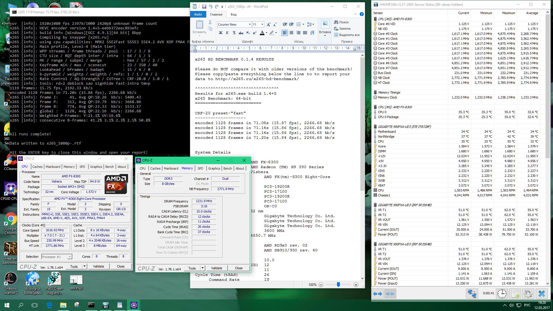 вот х265 ,всё время пляшет FPS от 15.60 до 15.93 вот в общем средний прогон ,ночью по пробую ещё картинку пере вложил первый тайминг снизил на скрине HWinfo на температуру не обращайте внимания и есть такая закономерность чем выше к 70*С градусам температура тем выше FPS и стабильность в прогонах в общем по нижней планке для 4.9 проходит