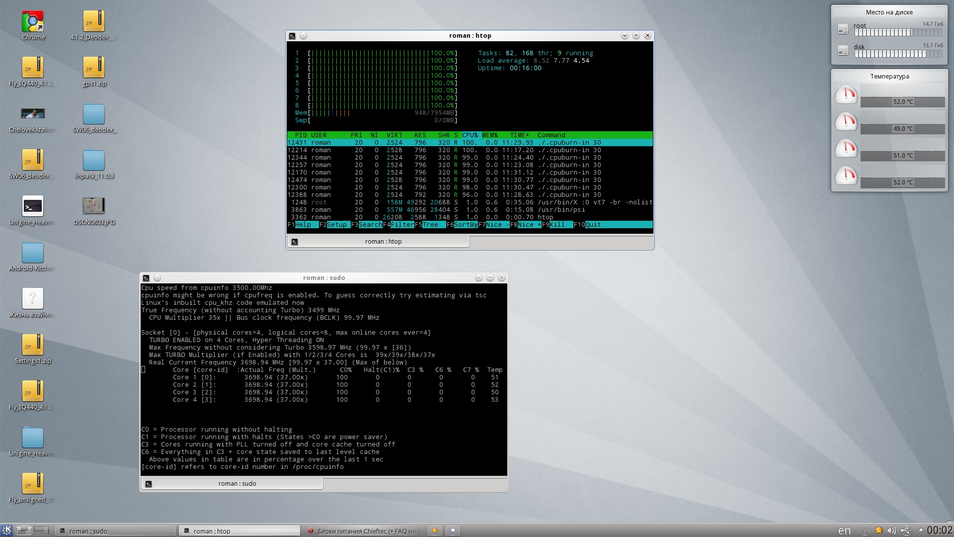 Намазал я, наконец, жм вместо пасты. Сразу скинул 25 градусов. Что самое интересное поднятие напряжения с 1,32 до 1,52 добавляет всего 7 градусов. Тем не менее, даже с 1,52 не получилось взять более 4,7 с нт