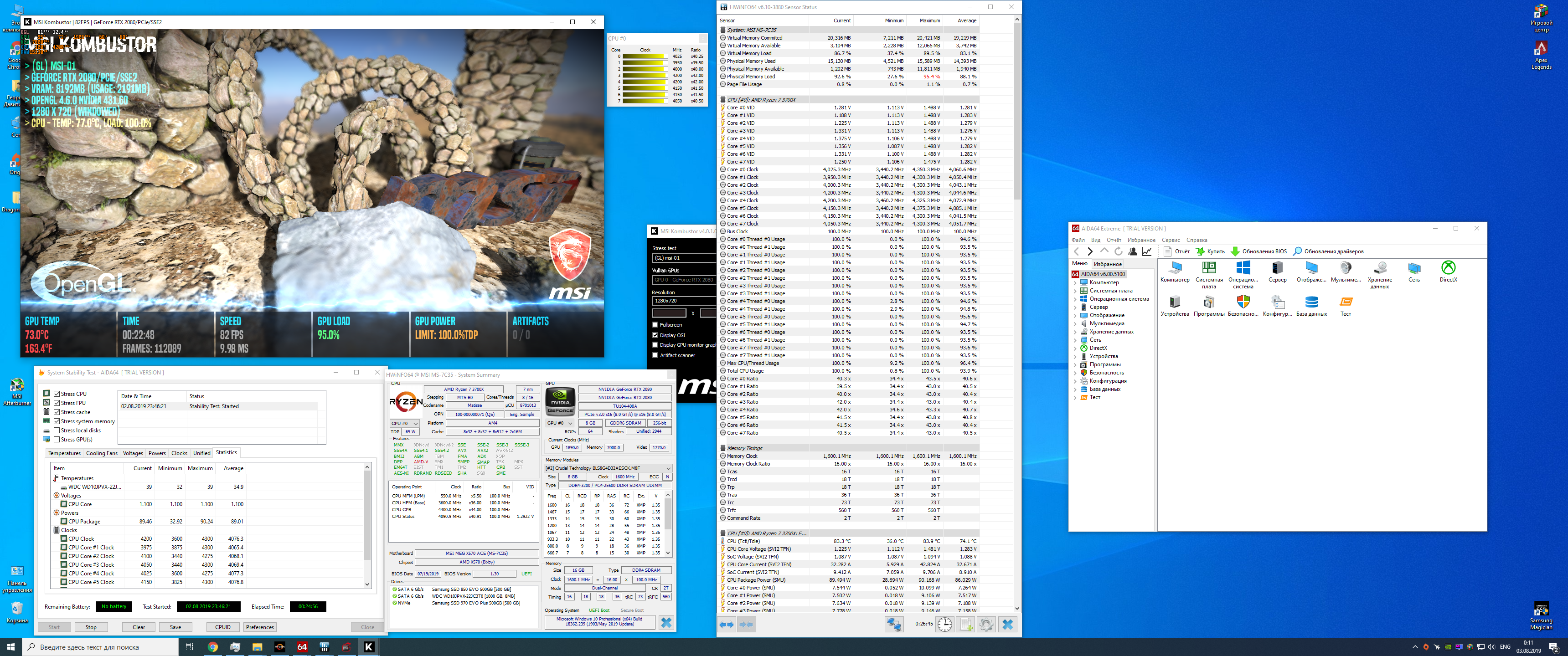 Прогнал двойной стрестест порядка 20+ минут, посмотреть температуры в закрытом корпусе, но с хорошей организацией притока воздуха. Интересно справился бы Ноктуа с 3900х? Иногда температура поднимается почти до 84. Что порадовало, у МСИ более - менее адекватное охлаждение чипа, карта его нагрела но не смертельно (62 градуса и он включается как раз).