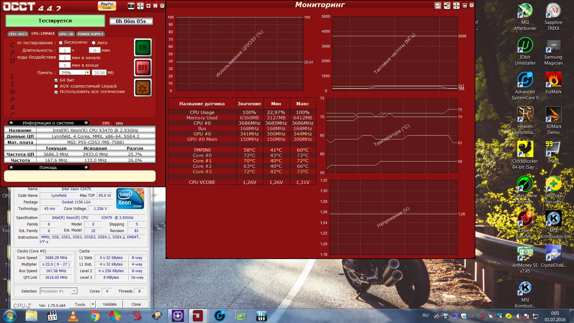 Надо бы конечно поискать напряжение пониже, но этож сидеть надо, тестить, пробовать. Да и если просто играть, то 1.2 хватает, но на тесте линкс комп зависает даже на 1.23, а на 1.256 не зависает. Я такие вещи обычно на несколько дней растягиваю пока что напругу оставил как есть, частоту выставил 168х22, общая 3710 Мгц