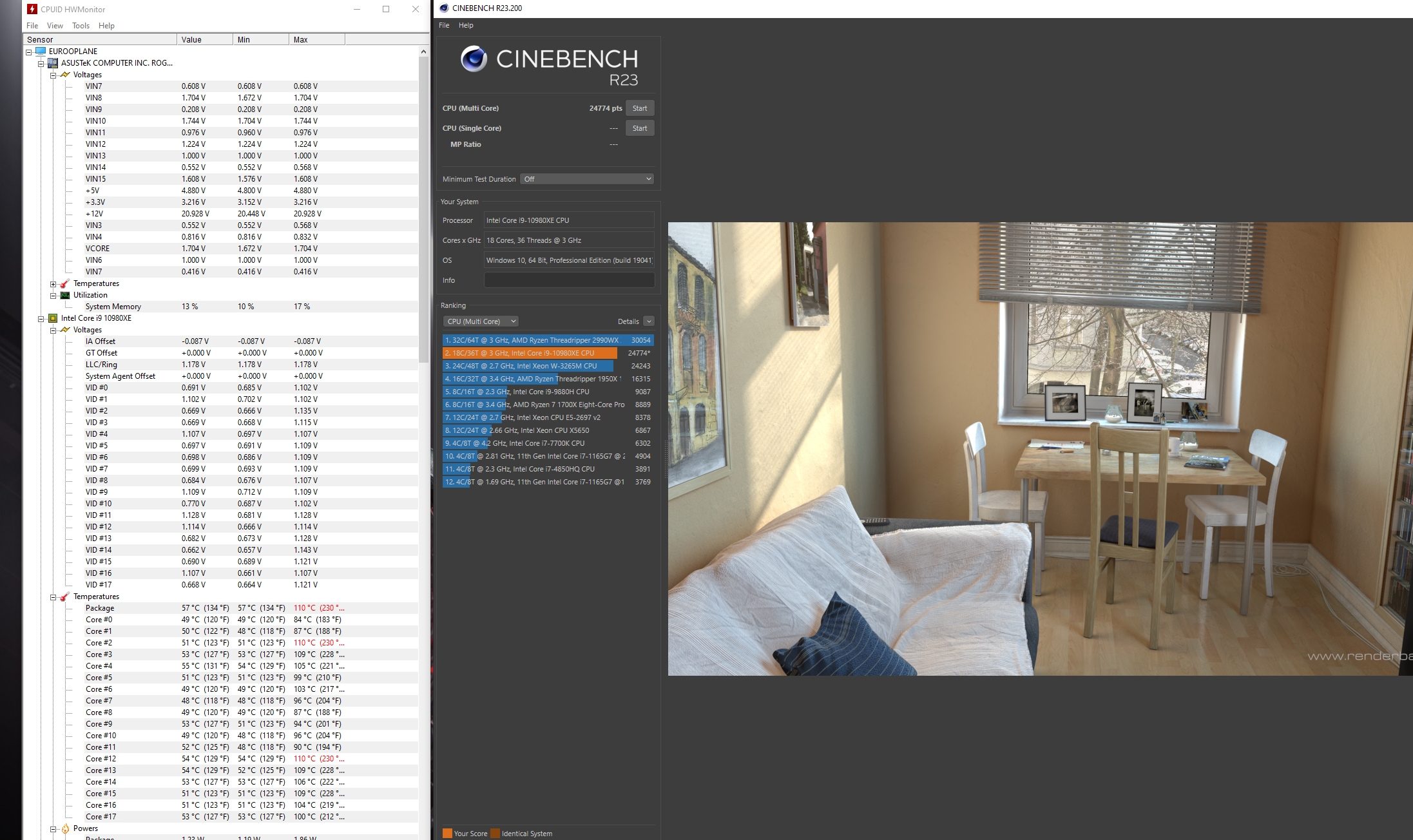 Похоже на некачественное нанесение термопасты и/или не корректную установку водоблока. Пленку с водоблока сборщик случайно не забыл снять? У меня набирает 22150 попугаев, а у Вас 18 ядер и 24774. Не слишком подозрительно низкий результат?