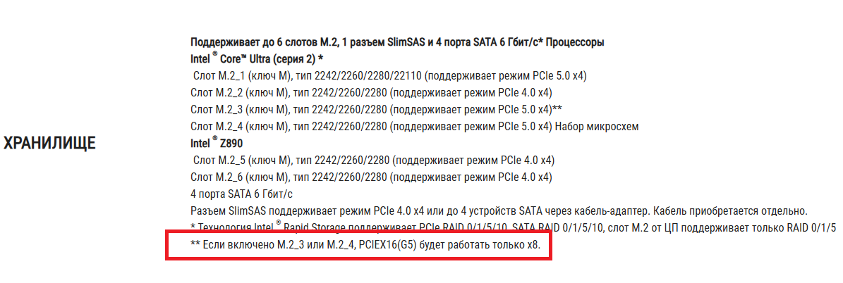 Просто другой перевод. Смысл тот же. Спецификации по линиям на Z890 одинаковые. Любой занятый слот Gen5, кроме верхнего 2.1, режет линию PCI-E в два раза.