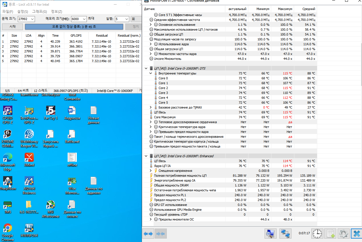Да запустите вы уже обычный Линкс, версии 0.9.7, 0.9.11, без разницы. Память хотя бы 6-8 ГБ, число прогонов 5. Он кстати жарит посильнее обычного Линпака, у меня на обоих процах разница 6-7 градусов была.