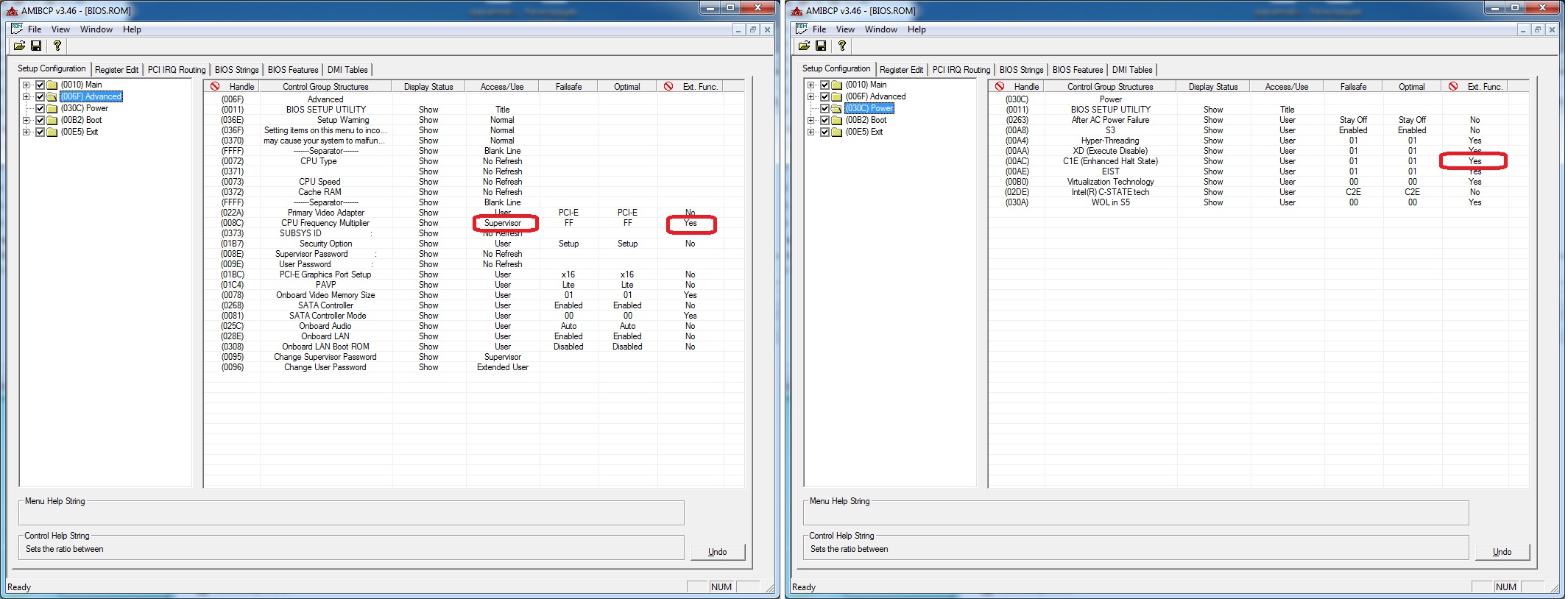DeathBringer, добрый день! Поиском нашел ваши сообщение в этой теме. У меня похожая ситуация. Пытаюсь установить XEON E5450 SLBBM в комп HP Pro 3010. Материнка IPIEL-LA3 rev. 1.02, AMI BIOS, в оригинальный BIOS 5.17 Rev. A я добавил соответствующие микрокоды. После этого в AMIBCP v3.46 попытался разблокировать скрытые пункты (CPU Frequency Multiplier и C1E (Enhanced Halt State)) в меню биоса по этой инструкции. Изменение ячейки Access/Use с Supervisor на User ничего не дало, а ячейка Ext.Func. с параметром Yes не редактируется. Подскажите, как разблокировать скрытые настройки в BIOS? Заранее пасибо P.S. Если вам удобней в личку, то можно пообщаться в ней