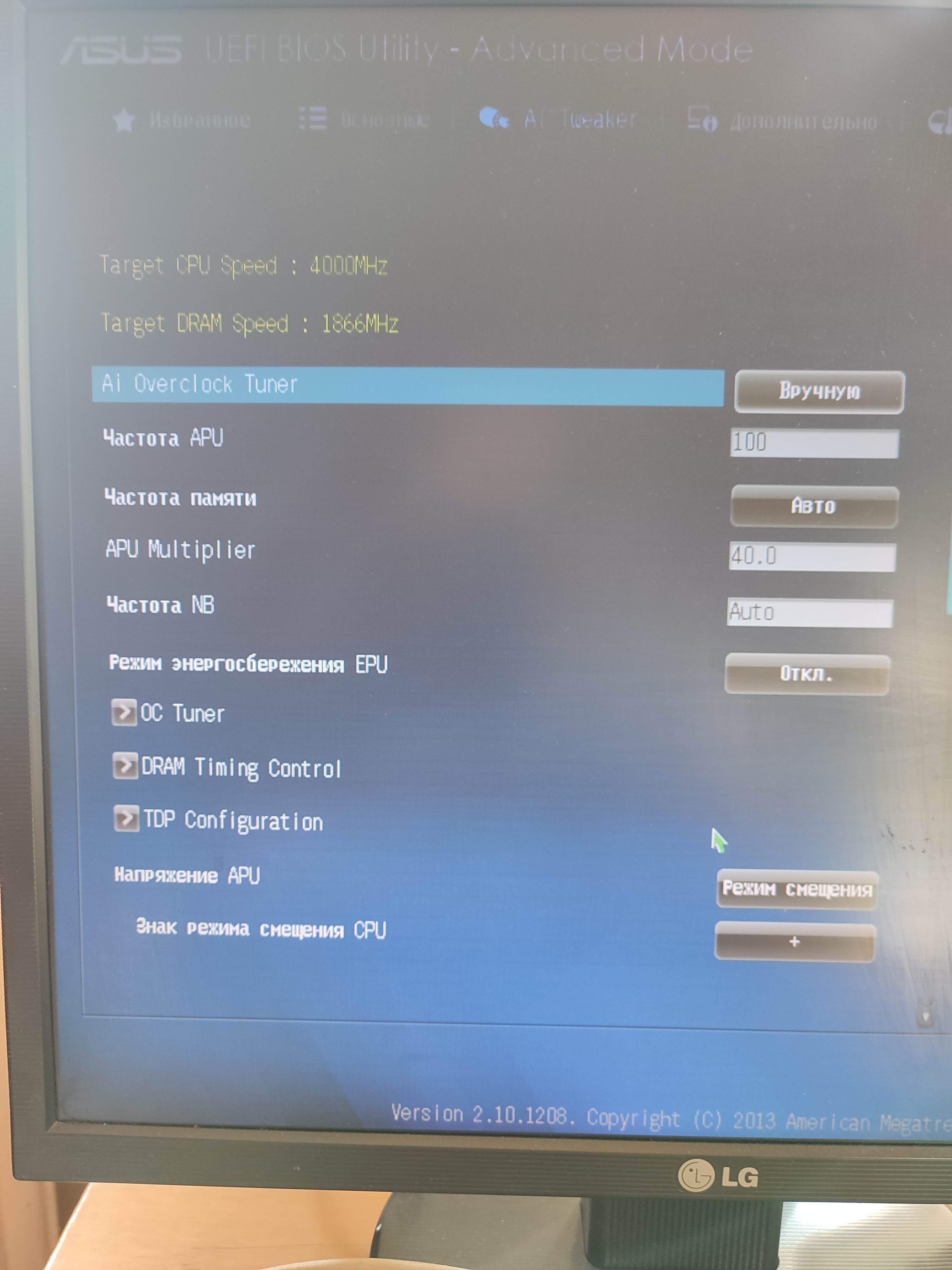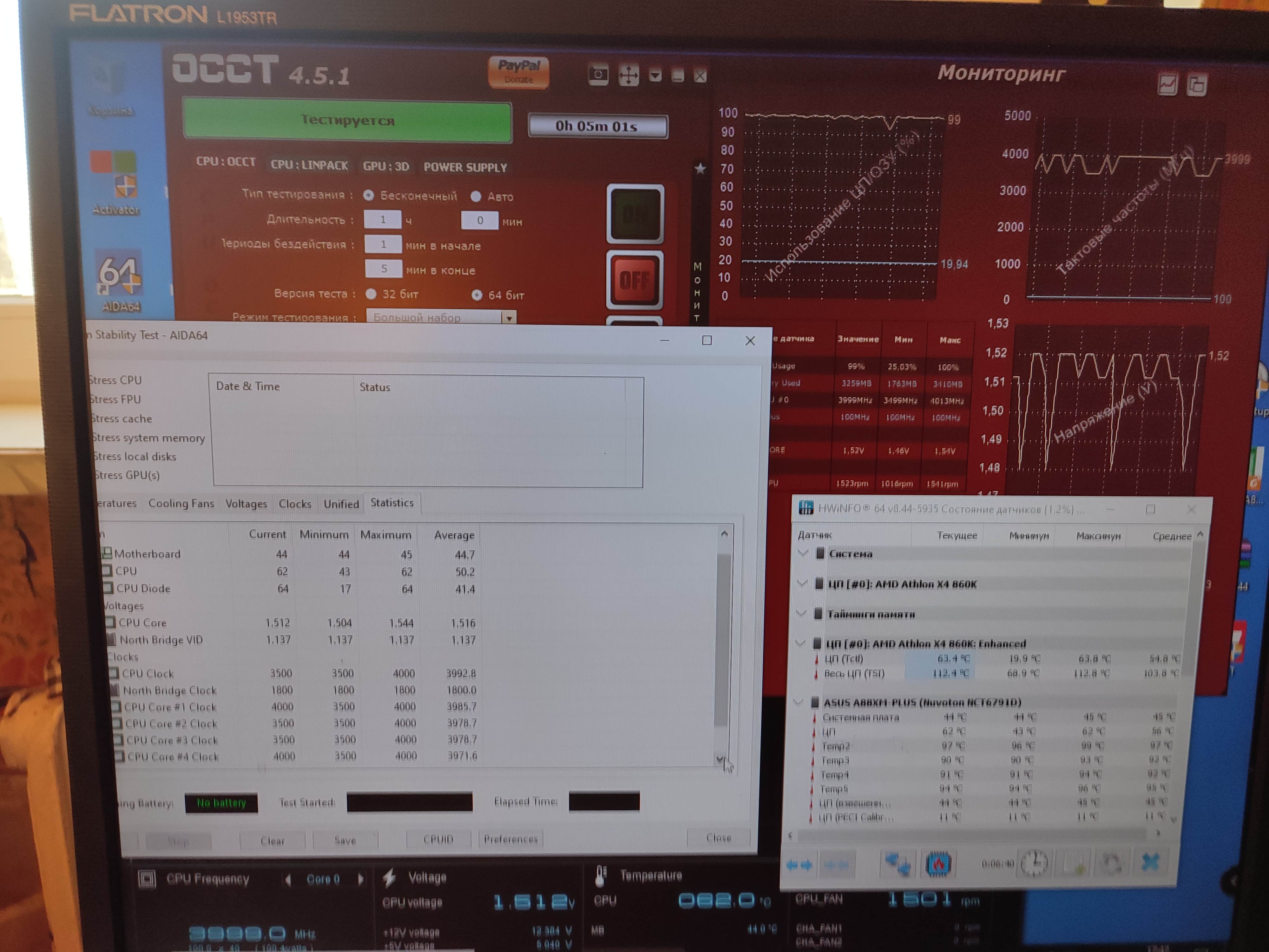 Нужна помощь в разгоне. Есть процессор Athlon X4-860K, материнская плата ASUS A88XM-PLUS, на процессоре кулер Oklick OG-CPC180-PWM1 180Вт, над системой питания процессора – 8 см вентилятор. Процессор загружает систему на 4,3-4,4ГГЦ. Без нагрузки частота не падает т.е. все энергосберегайки отключены. Под нагрузкой - даже если разгон всего до 4,0 ГГЦ где-то через минуту теста частота периодически падает. Как я понимаю перегрев либо процессора (что мне кажется маловероятным - температуру процессора замерял разными программами) либо системы питания. Скрины настроек и теста прилагаю – возможно в настройках что-то упустил.