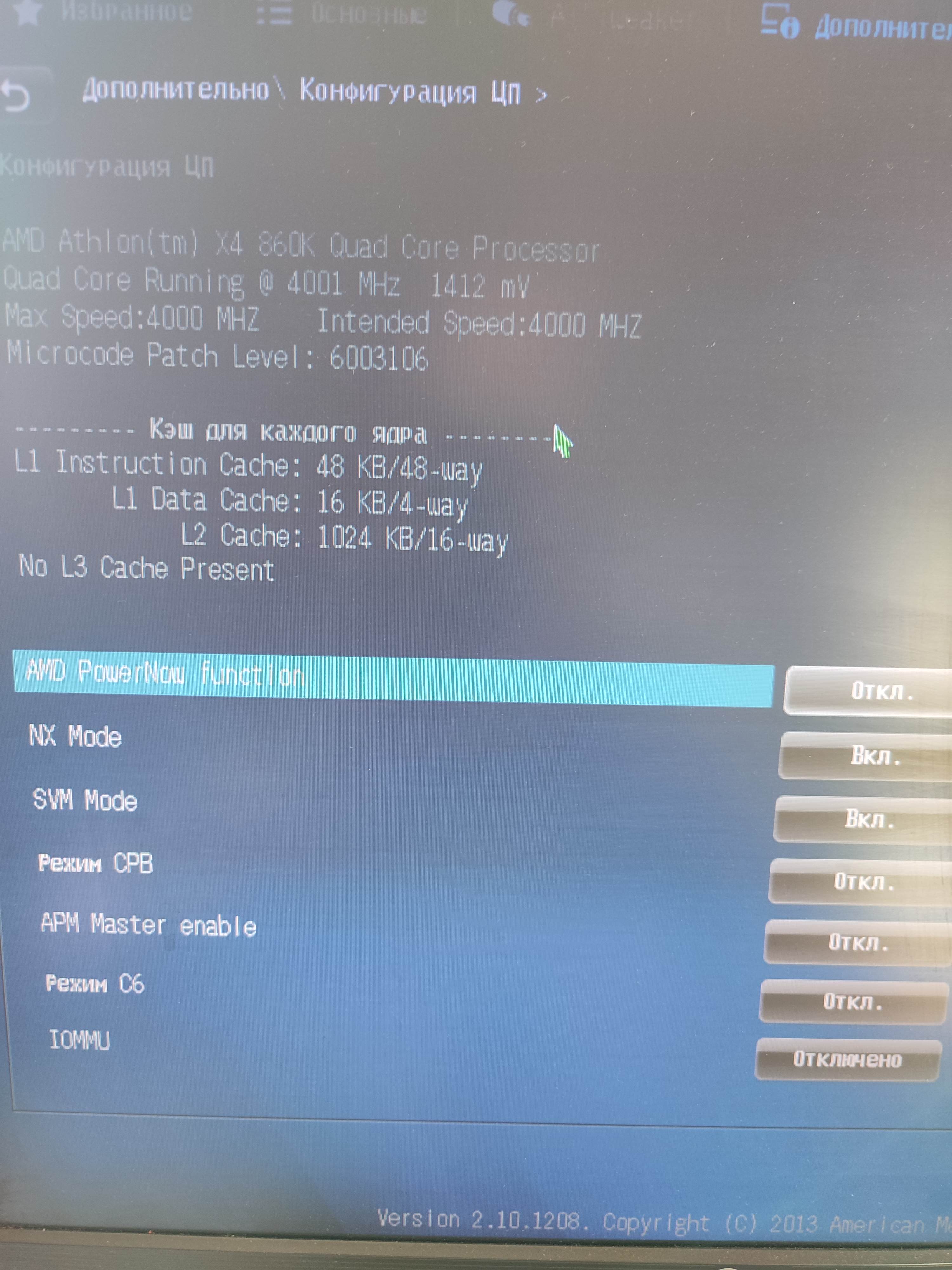 вообще такого быть не должно тк у тебя нет встройки,на первый взгляд упустил ограничения по току они не повышены,хотя не факт что это поможет,память почему-то без разгона убавь темпарутуру проца уменьшив напряжение,62С некорректные показания по факту там 70-75С,это перегрев для этих процов тем более что у 860K высохшая паста под крышкой у меня щас есть доступ к такому стенду могу попробовать проверить,скрины биоса и тд лучше делать через f12 и с компа тк у тебя фотки плохого качества мутные так есть 860к скальп но не факт что рабочий,есть а10-7700к он подойдет это тоже самое 2-4,встройку отключу тк будет внешняя карта