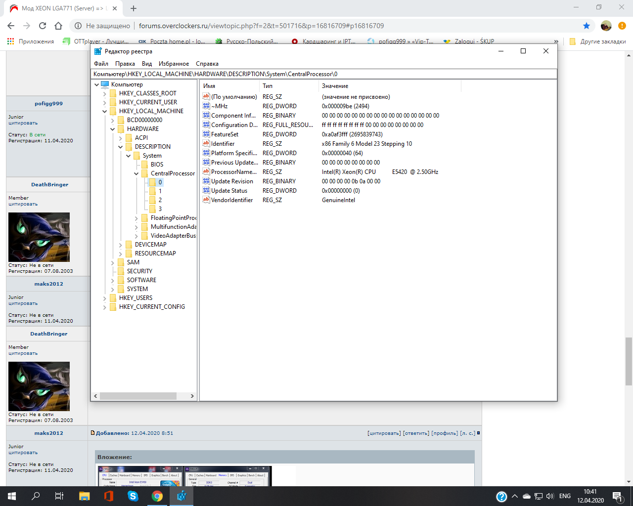 pofigg999 В BIOS Load Defaults делали? Загрузиться в Windows можете? Покажите скриншот regedit с раскрытым ключом HKEY_LOCAL_MACHINE\HARDWARE\DESCRIPTION\System\CentralProcessor\0