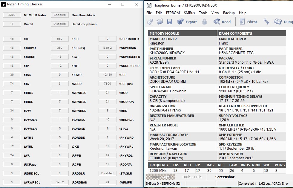 было протестированы тайминги 16-18-18-18-38-56 faw 39 rrds 6 rrdl 8, procodt 30-96 1t, 2t, geardown-disable, bankgroupswap-disable, bankgroupswapalt-enable. 2 режима напряжений: максимально безопасное soc 1.090 (по факту в винде выше ближе к 1.130), ddr voltage 1.40v, vddp +0.080 (в винде около 0.980), vpp auto но пробовал и повышать эффекта это не дает для стабильности как мне сказали это для бенчей параметр. минимальное под разгон: soc 1.030 (по факту в винде выше ближе к 1.070), ddr voltage 1.35v, vddp +0.020 (в винде около 0.913), vpp auto итого пару раз заводилось на procodt 48, 53.3 собственно скрины есть выше