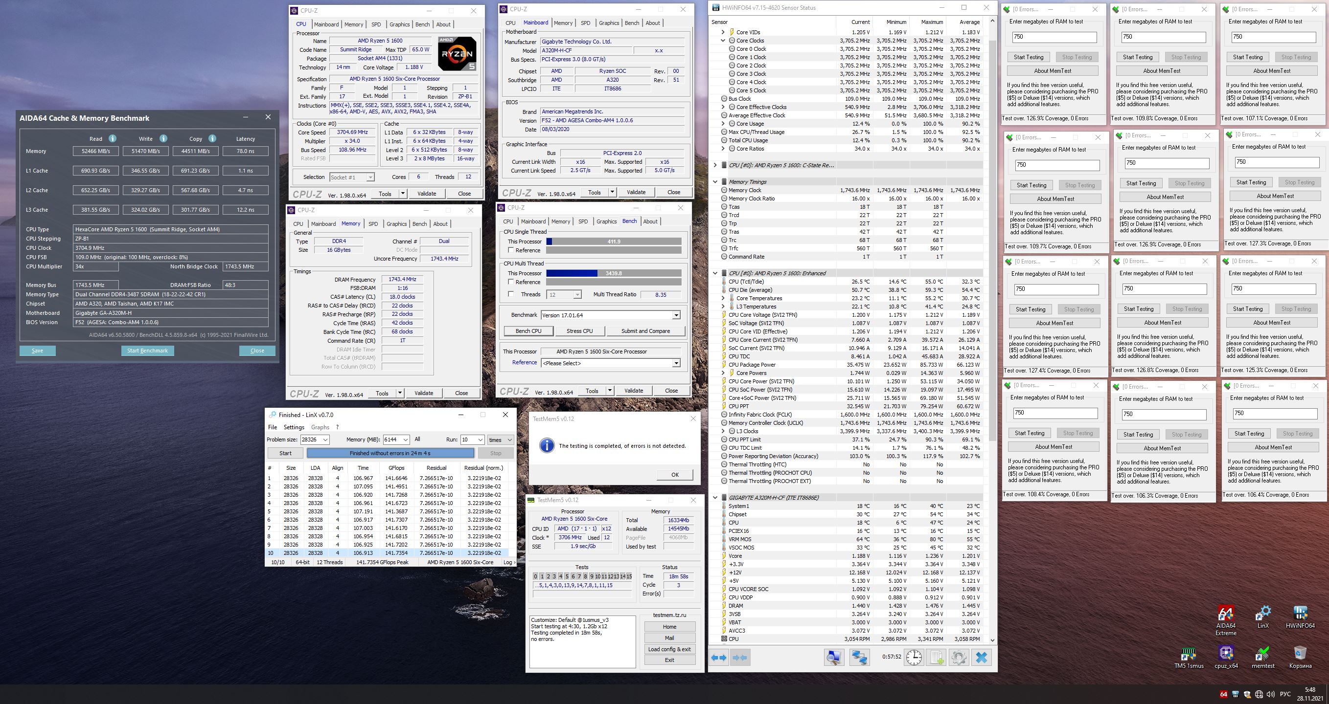 Любой протестированный разгон условно стабилен, т.е. с некоторой вероятностью. Чем дольше гонять тест и чем больше тестов тем вероятность выше. Память я бы еще в TM5 с пресетом Anta777 прогнал (там у него их 3 от легкого до хэви и они крутятся подольше) ну и на проц прайм95 на полчаса хотяб (если сомнения в питальнке платы то выставить кастом мод и FFT Size 256-512), минут 40. И успокоился на этом.