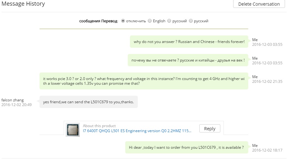Это наверное "computer cpu Store" и "Angle baby" ? Ещё когда не было ажиотажа, в конце октября заказывал, он мне неделю мозги поласкал. "my friend, we will send you soon" и т.п. , в итоге я сам отменил заказ. У него этот лот уже несколько месяцев висит, а отзыва всего два. Он видимо посылает тем, кто у него вообще ничего про проц не спрашивает, ни про видео ядро, ни про работоспособность и всякие PCI-E. Или по каким-то непонятным критериям очень аккуратно отбирает покупателей. Или может ездит на лошади в город раз в две недели, если заказ на это время попадет, то отсылает.