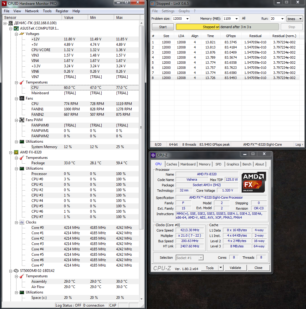 Ну как ребят разгон это или початок ? Триал HW монитор но основные показатели видно, не ту программу скачал:) 4.2ггц (значение в биос 1.3125), nb2600 1.35, ht2400 ,1866 11-11-11-2T 1.550v VDDA 2.6v(вроде положительно влияет на LLC но это не точно) (пока так работает не факт что будет дальше , в комнате 25-30 градусов , тест в закрытом корпусе)