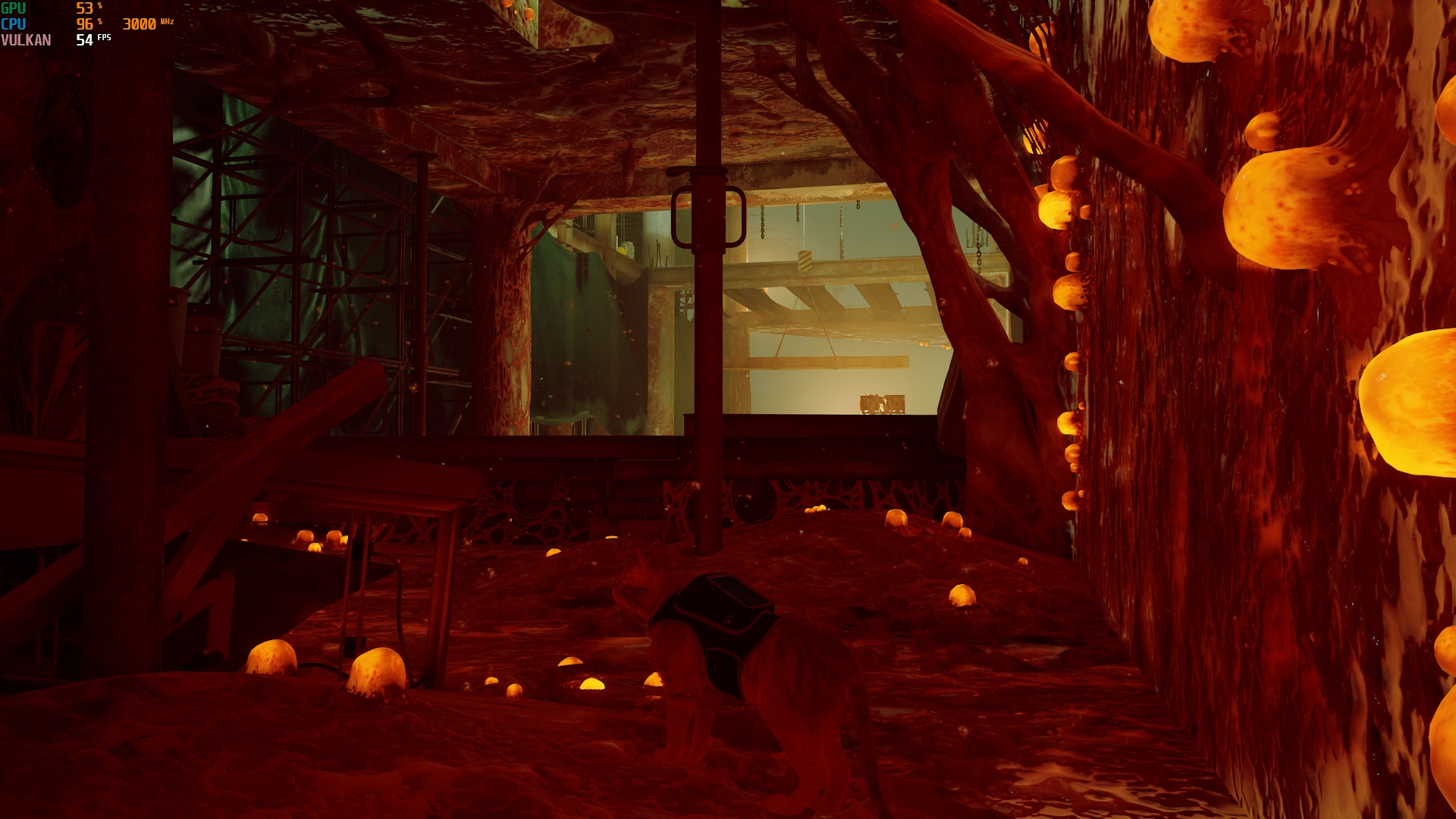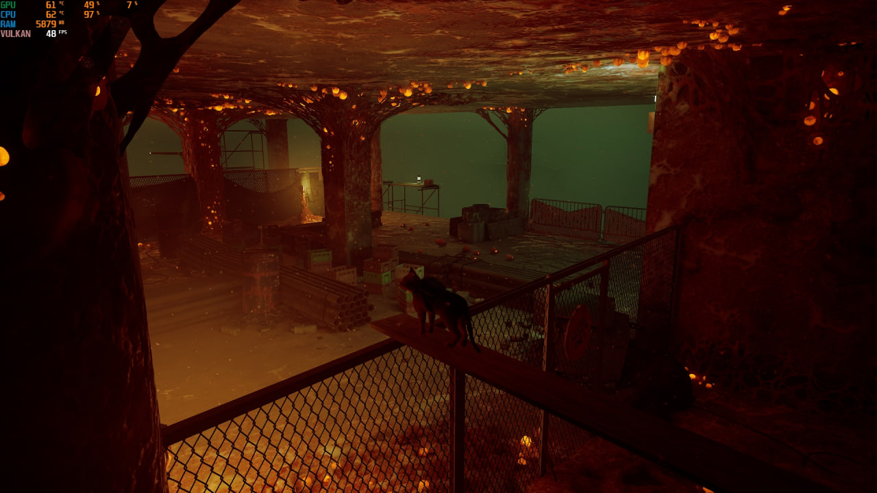 Вот один тестовый скрин, днем сделал. Stray, кто играл знает, сцена сложная пыли много летает и зурки кучами бегают. Тут да 48 фпс. Столько же +- будет на открытом мире. Установки максималки FullHD. Полный сток без разгона на шине 333 и 3.0 Ггц.