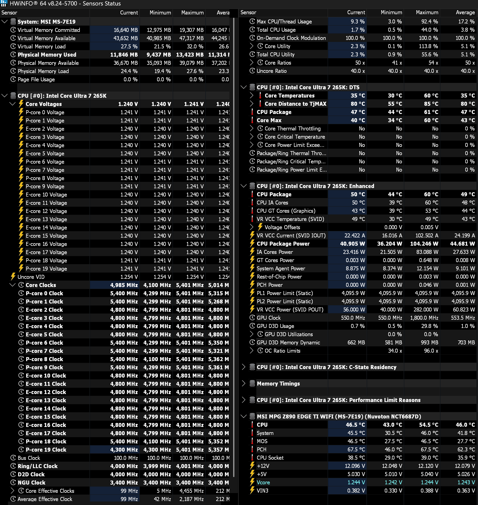 у меня VCC Core Voltage оно же DLVR оно же Vcore в хвинфо64 установлено на значении 1,24 В, столько же установлено и Core Voltage P+E ядрах, вроде работает