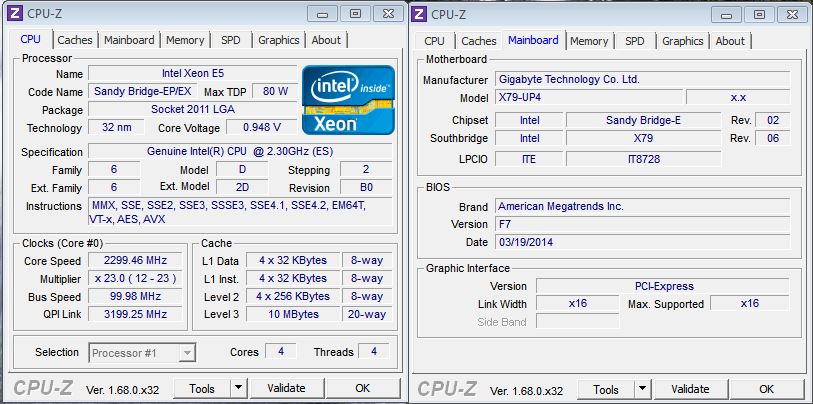 Xeon E5 ES QAFQ 2.3 GHz 4C/4T 10M Sandy Bridge-EP B0 stepping (схож с E5-2609, только частота на 100 МГц меньше) Плата GA-X79-UP4 rev 1.0 BIOS ver. F7