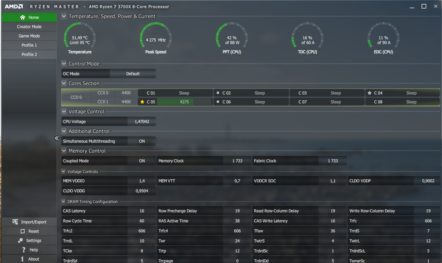Итак, миниотчет по переходу с 1600 на 3800х. Материнка на биосе с агеса 1001, но в целом всё работает нормально. Оператива - ОЕМный бидай на 2133, работает как 3200 16-17-16-16, из вторичек только trfc на 480 (ниже не хочет), trc на 52. Но из тюнищихся, которые реально можно попробовать занизить по сути только tFAW, tWR и tCWL, остальные очень близки к данным из калькулятора. На 3333 работает, но уже на 18х, оставлю пока так.