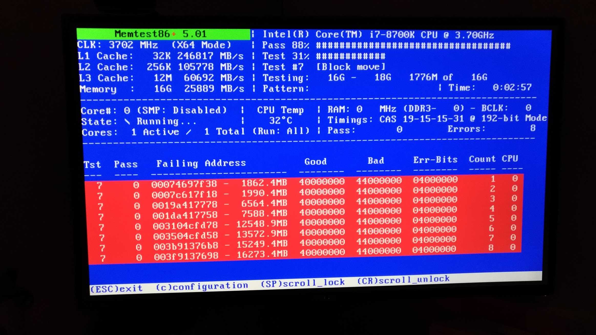 Я не инженер интела, но что то мне подсказывает что если бы навернулся контроллер памяти то память бы не смогла бы пройти тесты на 3866 и частотах ниже вплоть до 2133 причем на 2х разных системах с 7700к и 8700к или у обоих контроллер памяти приказал всем долго жить? И память не проходит только один тест в memteste - Block move, остальные все проходит. Ладно посмотрим что будет по гарантии, если все плохо то и мать с процом заверну и отправлю