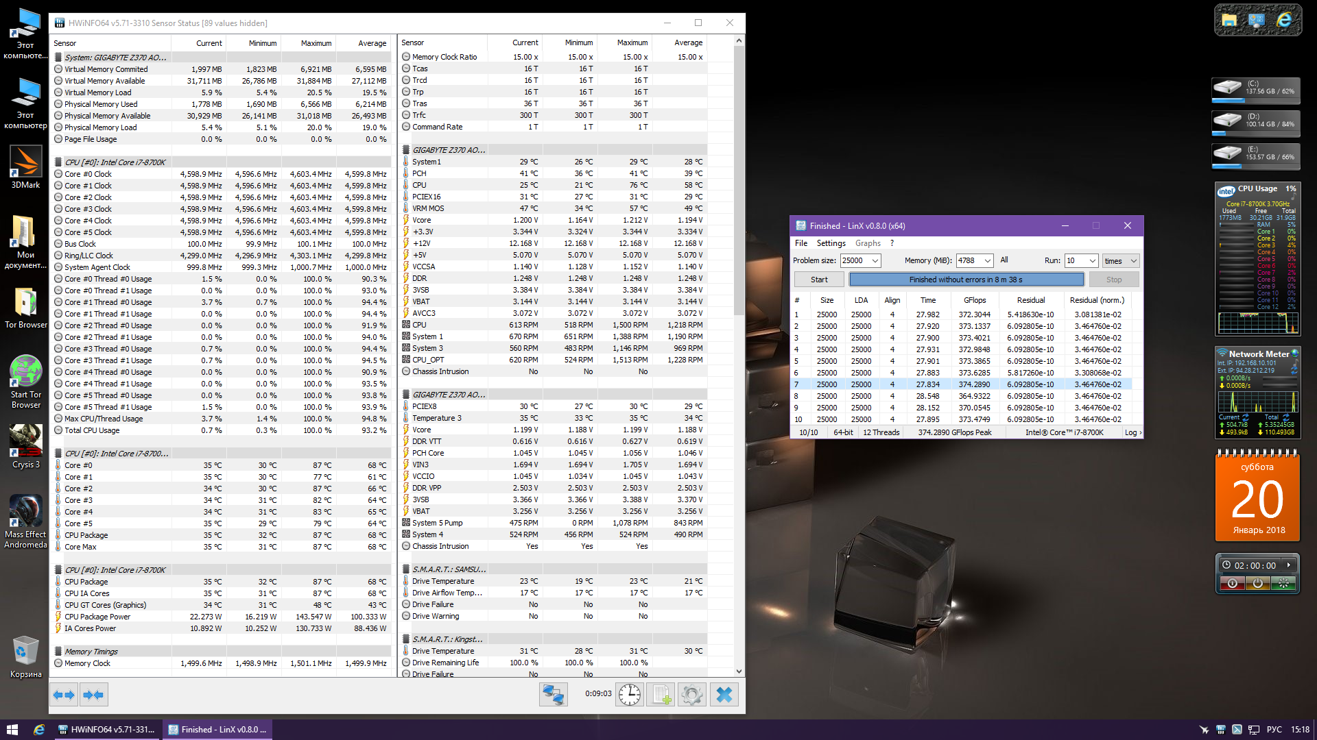 Полученный результат должен иметь следующий вид: Скриншот рабочего стола после прохождения >9 циклов (т.е. между 9 и 10 проходами). Вместе с LinX на рабочем столе должны быть развернуты CPU-Z (первая вкладка) и Core Temp, это обязательный минимум. Такой набор программ даст информацию о напряжении и температурах под нагрузкой-простоем. По желанию можете добавить другие программы, показывающие дополнительную информацию о вашей системе, например третью вкладку CPU-Z, которая покажет модель материнской платы и версию BIOS. Пример результата разгона: Mad Max, 5100 МГц (AVX 0), i7-8086K, HT-ON, Cache 4700, Vcore=1.36V, Batch L805E123, Gigabyte Z370 Aorus Gaming 7 (bios F6), Be Quiet! Dark Rock Pro 4, ЖМ под HS, Windows 10 Pro 64-bit 1809, LinX 0.9.3 64bit.