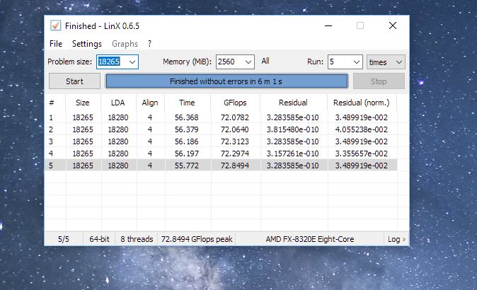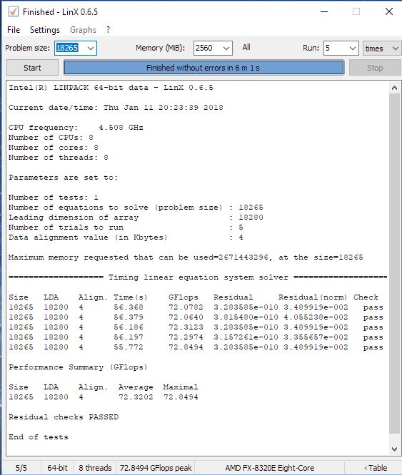 Прогон сегодня делал на 4.2 ггц при <<<size 16000>> выдало 84 Gflops а тут при 4.5 - 75 , 4 года сижу на этой платформе ни кто внятно не обьяснил что происходит в linx =)
