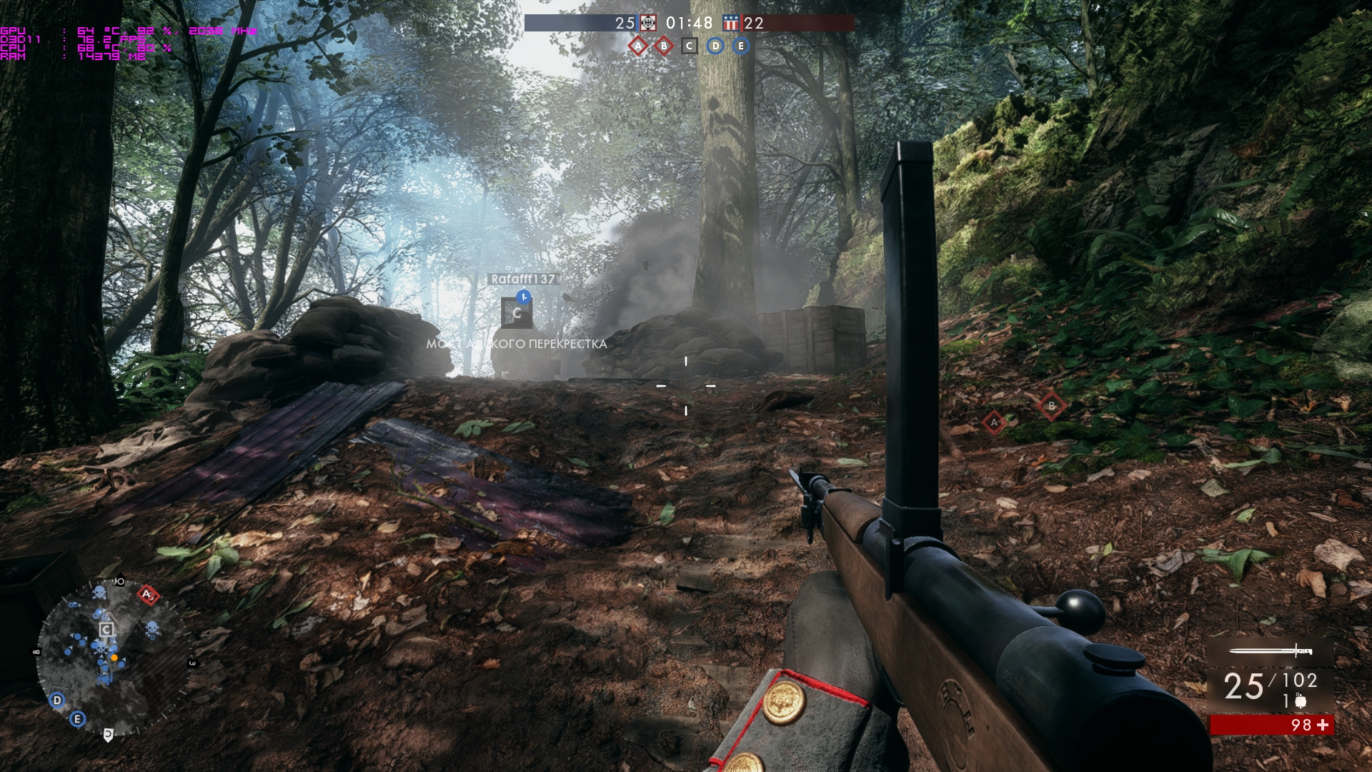 Если кому интересно, вот скрины бф1 ультра в фуллхд (масштабирование офк не накручено, имхо больше 100% это онанизм ) Видео 1070 6гб проц и7 870@3.8 32\32 (иногда проц под 100% загружает, но для разгона больше чем 3.8 стоит скальпировать этого друга, температура разочаровывает)