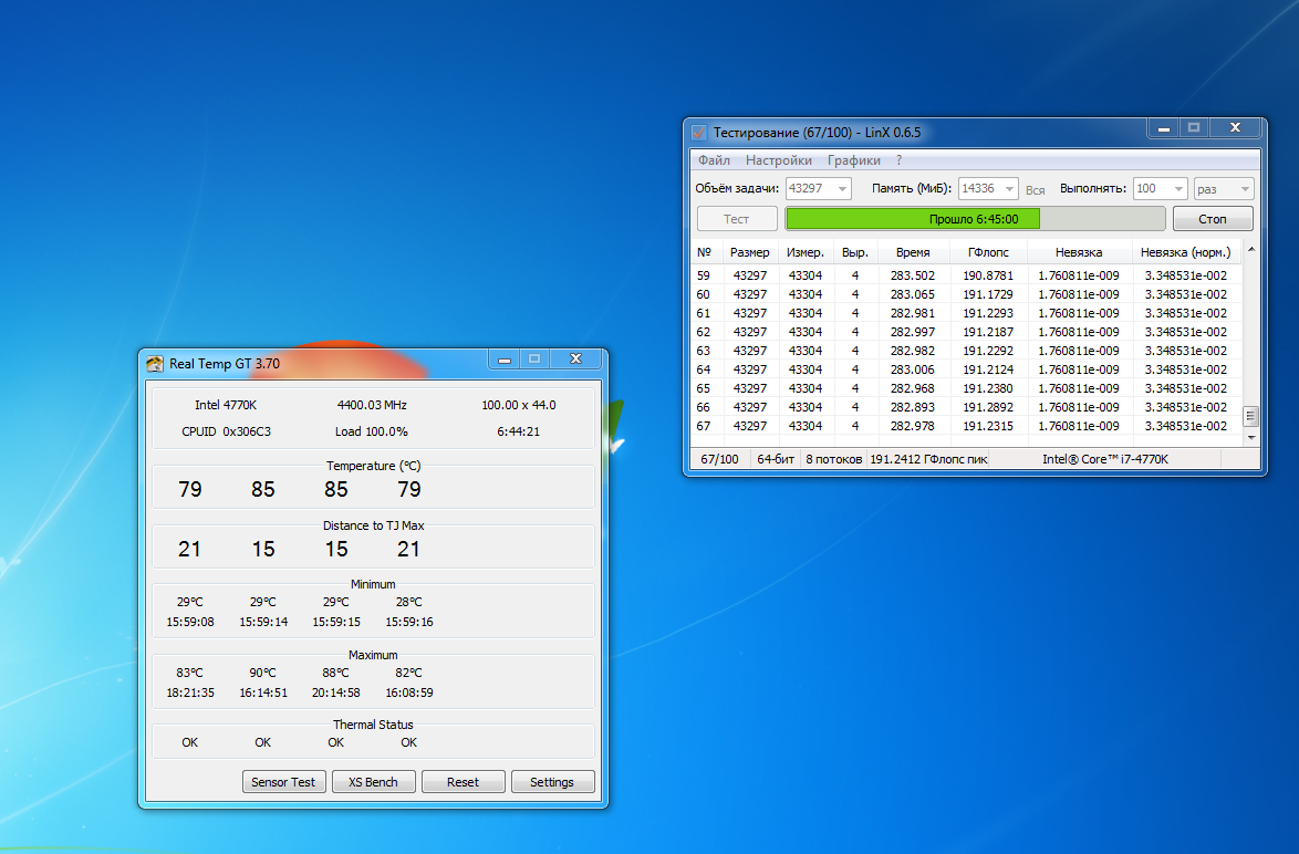 Можно ли считать систему стабильной? 4770к -4400Mhz 1.26V память 1866Mhz 9-9-9-25 Linx 1.65 67 прогонов объём задачи 43297.