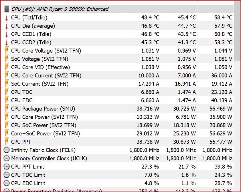 При этом методе игнорируется лимит EDC, лимит TDC настраивается исходя из возможностей VRM, какой ток в амперах материнская плата может максимально выдать не перегревая VRM, лимит PPT это максимальное потребление процессора, особенно актуально если система охлаждения очень инертная. 5900X/5950X упрутся в температурный лимит в 90°С на самом горячем CCD, 5600X/5800X в 95°С, эти значения можно уменьшить при помощи настройки Platform Thermal Throttle Limit. Последние 5°С до этого лимита дают приличные пенальти к бусту.