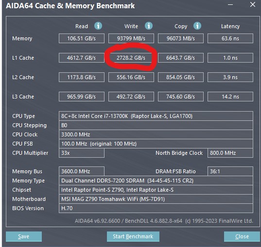Подскажите, пожалуйста, загнался таким вопросом i7-13700K и MSI MAG Z790 Tomahawk, почему L1 write cache 2700, когда мой же проц на всех обзорах 3300 и даже получилось снять мой проц и поставить товарищу на его MSI MAG Z690 Tomahawk - и у него 3300, почти 3400! Где косяк у меня? Спасибо